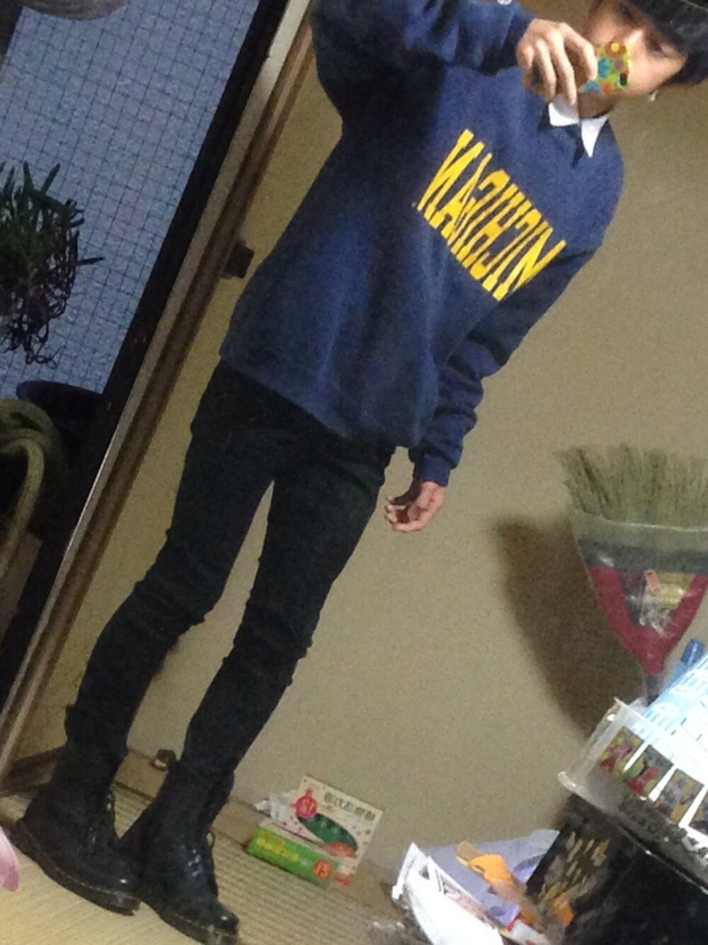 トレーナーの下に無地の白シャツを着ることで大人なイメージにしました! 靴はドクターマーチンのブーツでスキニーに相性が◎ 今年の冬はブーツを履きまくります!笑