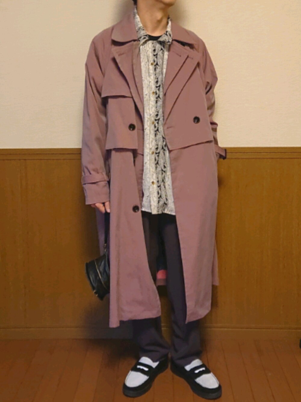 いつもご覧いただきありがとうございます!! 悪天候の為、撮影場所変更w☔ 一目ボレしてポチったCASPER JOHNの柄シャツ☺️ もーこーゆー柄ドンピシャで好きです😆 HAREのコートは文句無しで良すぎるし 明るいパンツ履こうかなーと思ってましたが、どうやら今日はドンヨリ空模様のようなので、濃いめのパープルカラーのパンツを😎 丸ポシェットを添えて よし 美容室いってきまーーす✂️