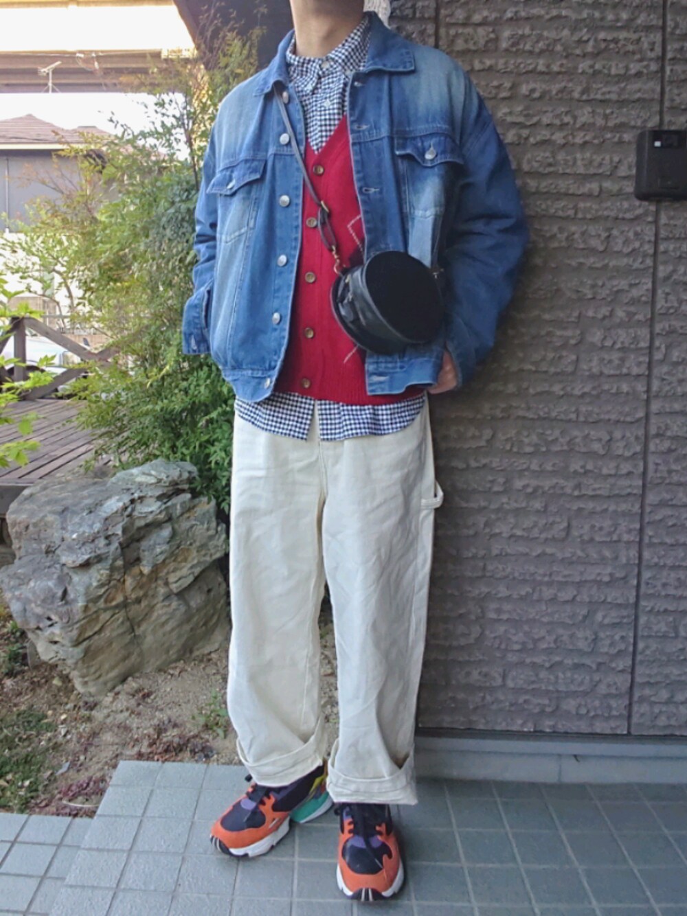 いつもご覧いただきありがとうございます☺️ 今日はデニムジャケットとギンガムチェックシャツを合わせました☺️ ちょっと寒いので薄手のカーディガンをチラ見せ☺️ 赤が結構効いてます✨ 3日間行けばGW ま、どこも行けませんが😅