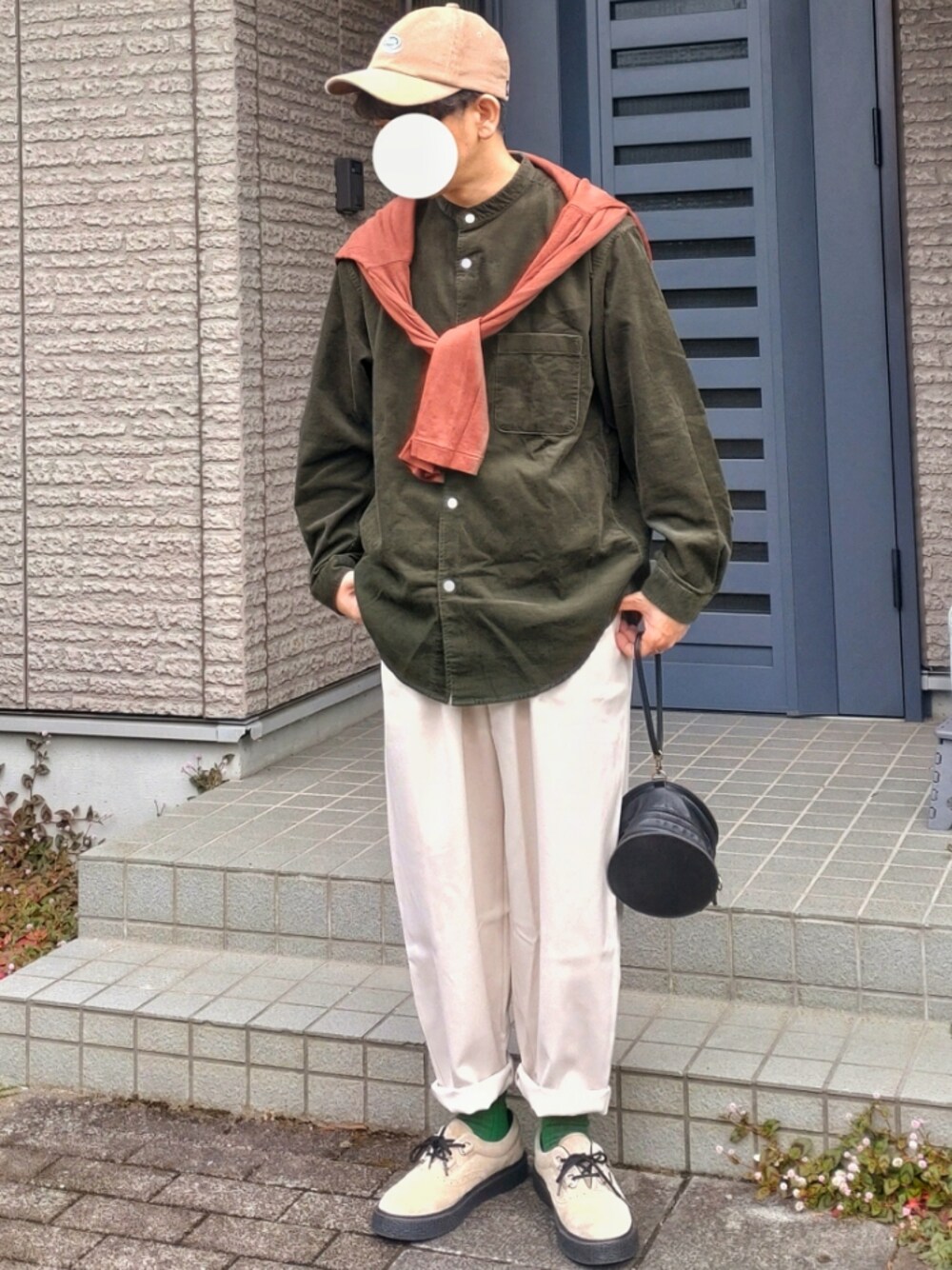 いつもご覧いただきありがとうございます☺ 秋カラーを分断に使いました☺ カーキのコーデュロイシャツにブラウンロンTを肩掛けコーデが抜群に相性良すぎました☺ パンツはオフホワイトで合わせましたが、ほかのカラーでも全然ありだと思います☺