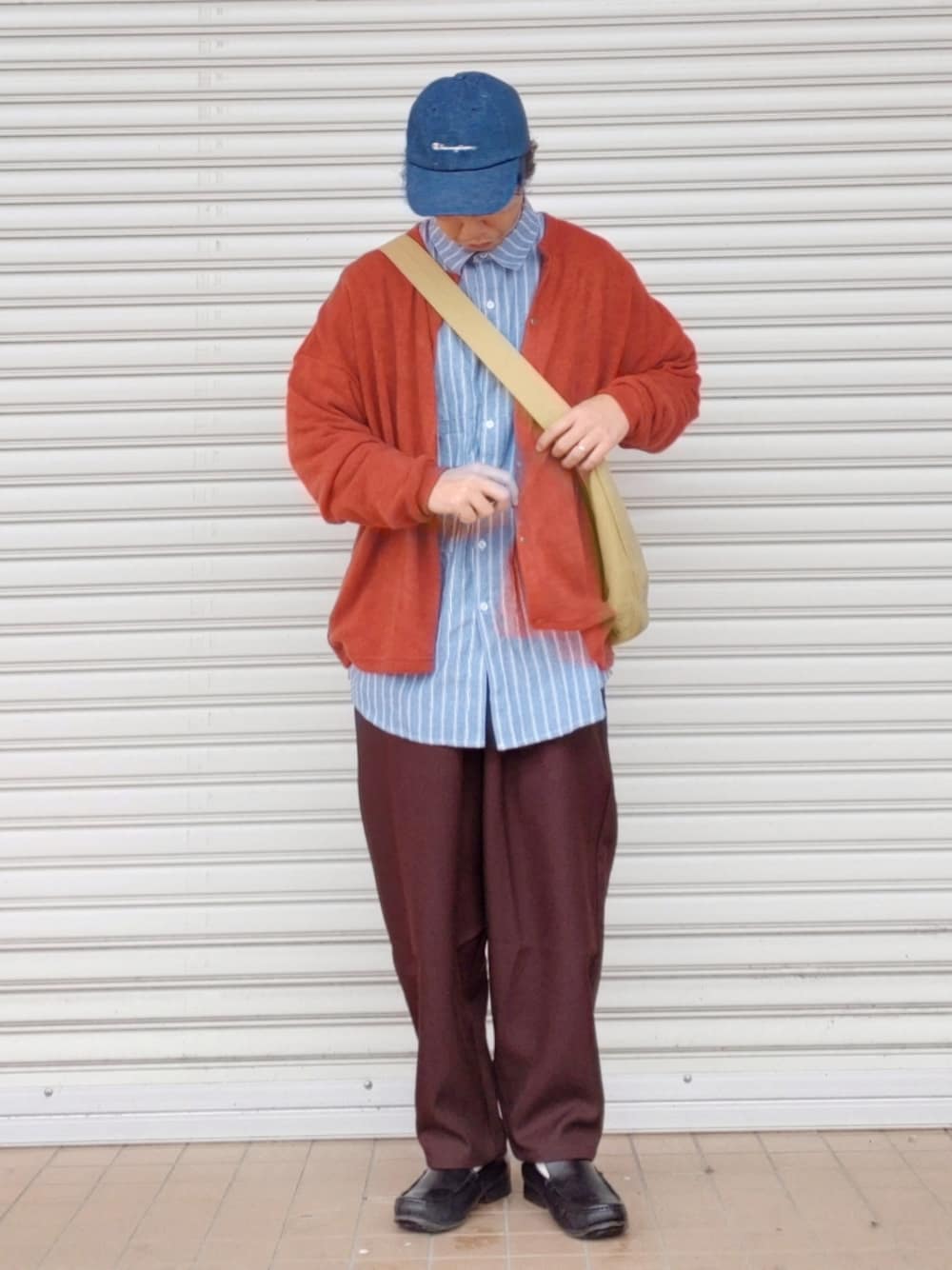 いつもご覧いただきありがとうございます☺ ずっとZOZOでお気に入りに登録して、値引きを待って待って待って待って、とうとうSALE!! しかもクーポンまで😭即ポチしたカーディガンをさっそく☺ 皆さんがオレンジカーディガン着てるのみながら、いーないーなとヨダレ垂らして待ってました🤑 インナーには青色ストライプシャツ☺ 秋っぽくしたいので、パンツはブラウンを☺ 地元は全然cityではないですが、cityboy意識でキャップ☺