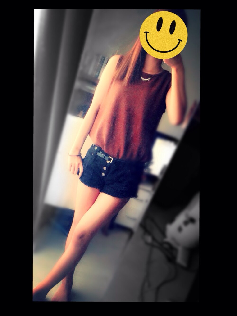 外に出てみたら思ったより暑かった;; トップスは秋色のブラウンだけど ノースリなので着ちゃいます(笑) ショーパンはどっかの安い通販でget ベルトは黒エナメル金バックルで、 洋服買った時についてきたやつ。