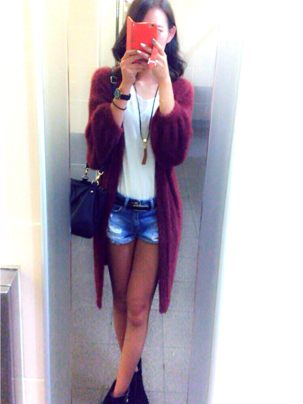 これ10月の… SLYで一目惚れで買ったボルドーシャギーのロングニットカーデだけど、1枚で着られる気温の日って少なくて難しい…🤔☁️