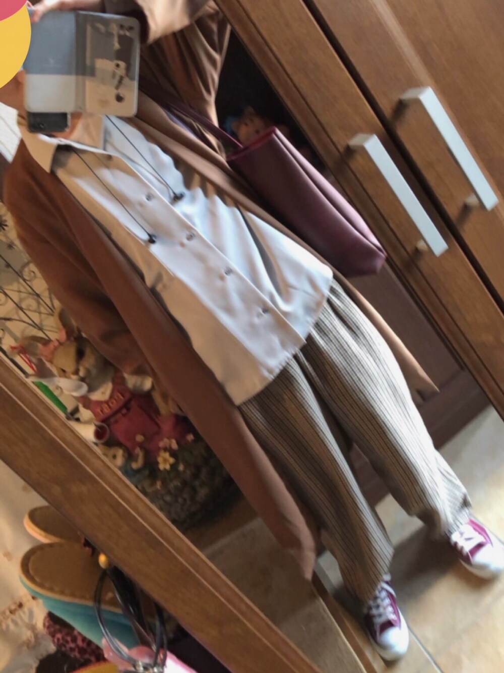 今日の服装です! キャメルのガウンに白の開襟シャツ パンツにearthのレディースのチェックパンツと 靴とバッグにボルドーカラーのものを合わせてみました!