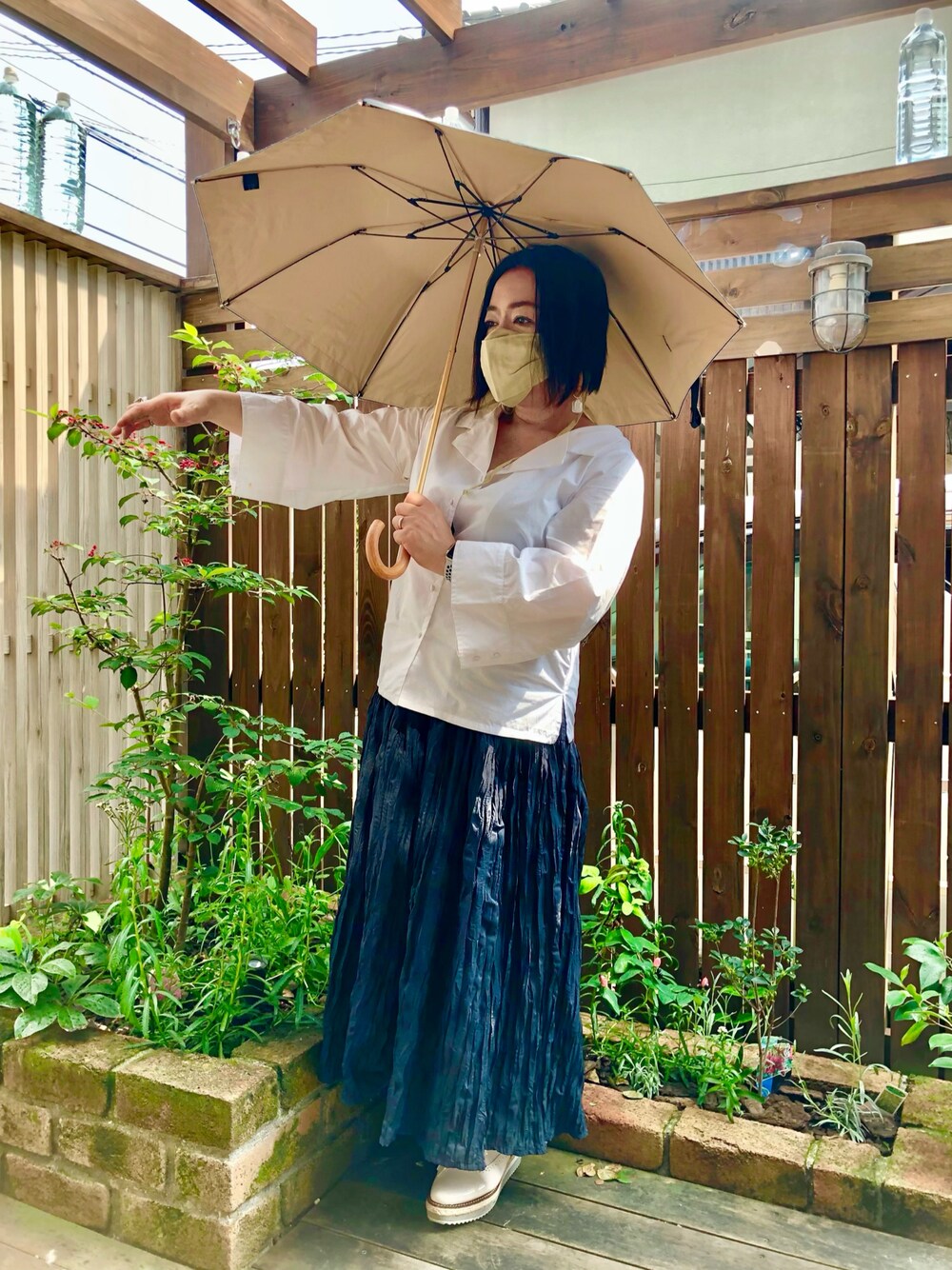 御覧下さりありがとうございます💦 キョンシーポーズ(時代が💦)をしている訳ではないのです。 長袖でも袖口が開いていますよの お知らせポーズです。 このシャツは衿ぐりも広いデザインなので かなり涼しいです。 雨晴兼用傘で日焼け止めをかなり意識して います。焼けると戻らないので。 白シャツにシワ加工のネイビースカートです。 ちなみにマスクは非売品です。 インスタはamoru in showko 色々してます。 よろしくお願い致します。