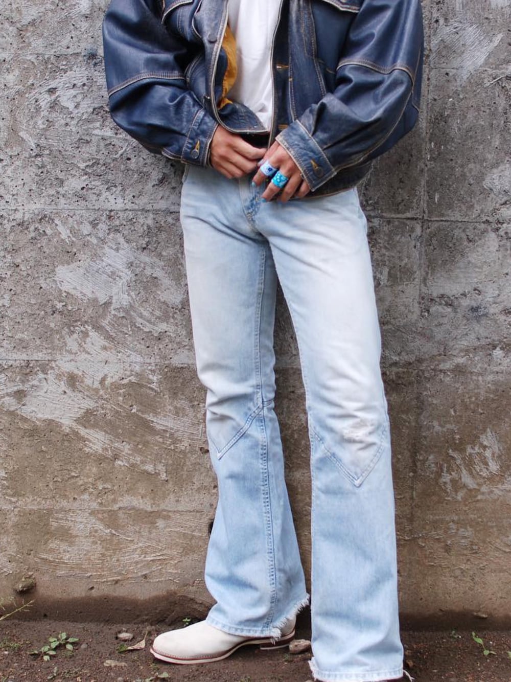 大阪の古着屋で購入した ベルボトムと 白のサイドゴアブーツを合わせてみました🇺🇳 全体的に水色で仕上げ 僕の作ってるバンダナリングとネイルで 統一感を出してみました