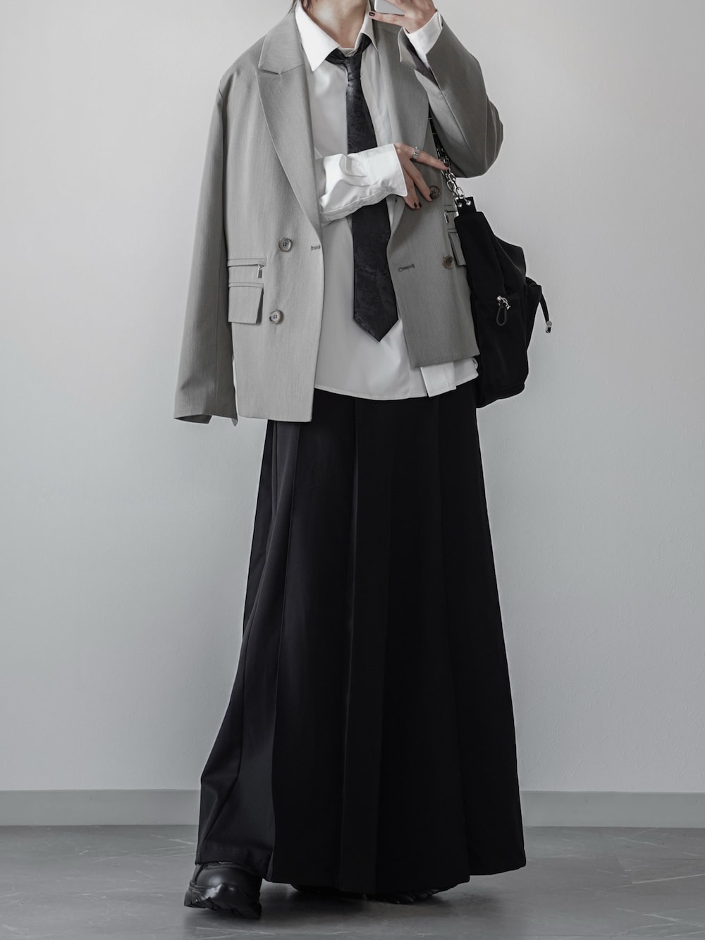 フォーマルのきちっとした雰囲気を崩したモード綺麗めスタイル👏 デザインとシルエットでファッション性を取り入れることで スーツ感のないスタイリングに仕上げてます✨ ジップギミックデザインが美しいテーラードに 深いタックとドレープで綺麗なシルエットにまとめる袴スラックス🥹 好きな人にはぶっ刺さりそうな雰囲気🔥🔥