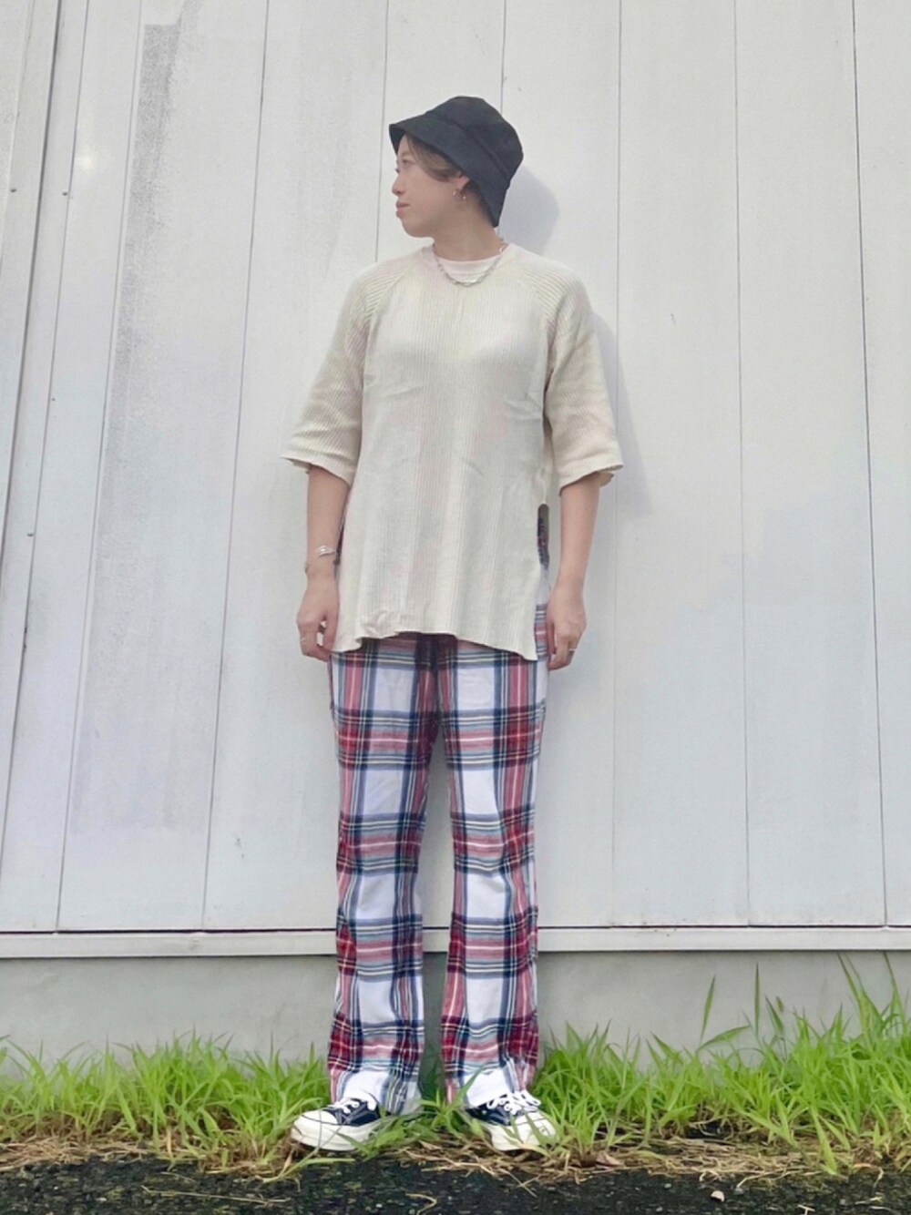 雨がすごかったですね☔️☔️☔️ 今日のテーマはコーデュロイ✖︎チェック。 コーデュロイのバケットハットとネル生地のチェックのパジャマパンツで素材感をぐっと秋っぽくしてみました😊