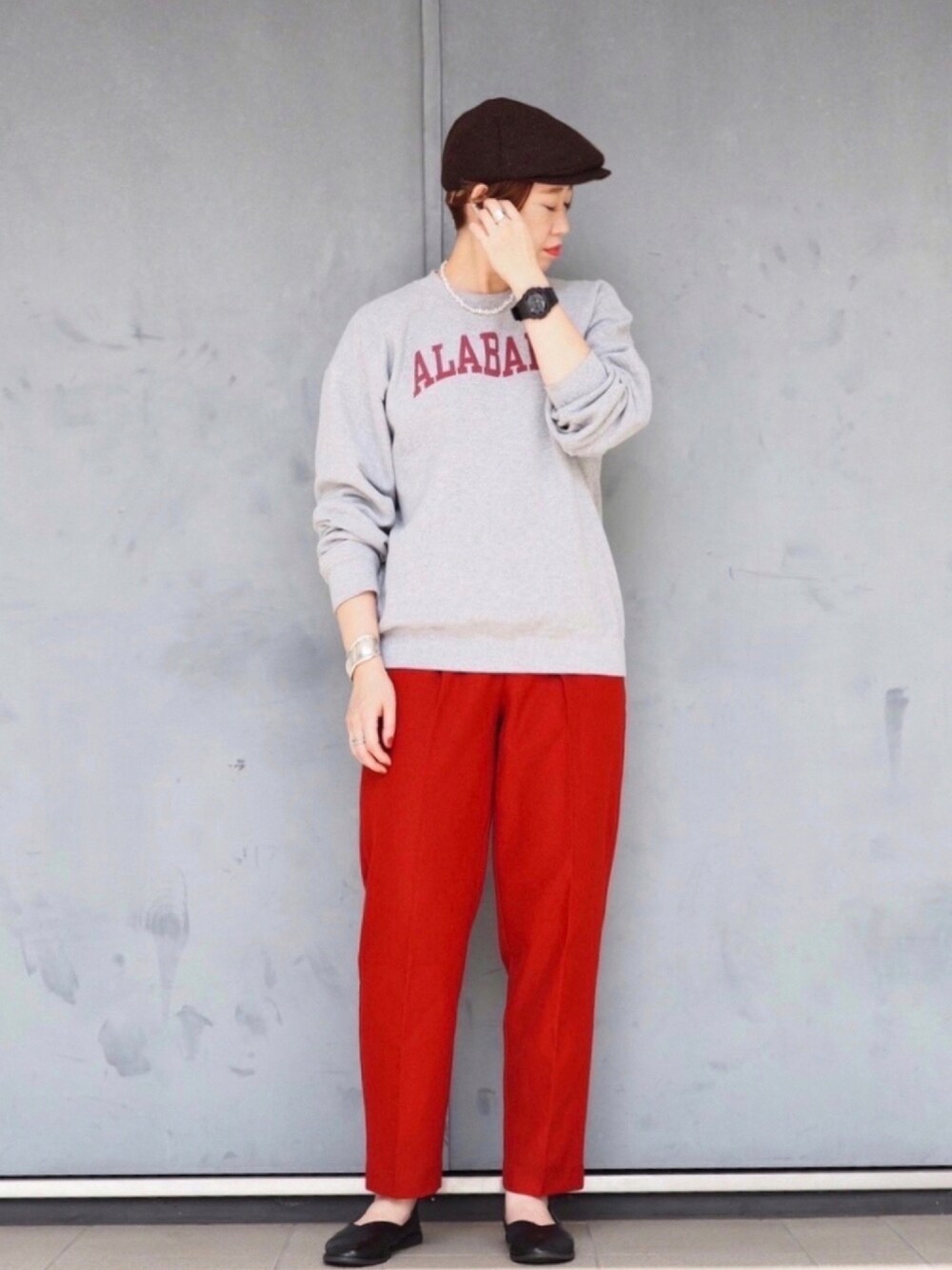 今日のテーマは赤とグレー。 スウェットのロゴとパンツとネイルの色合わせしました💅 ハンチングも赤茶系です🤠 ツイードのハンチング🍄 久々に選びましたが思いのほか、似合ってるとスタッフにおどらされて買いそうな勢いです🏃♂️💨w