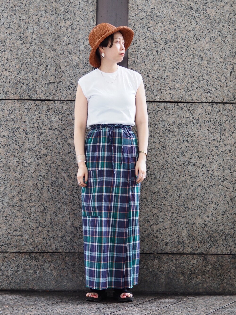 今日のテーマはラフィアとチェック🟩🟫 暑過ぎるのでノースリーブで夏全開☀️🌻 ラフィアのハットは風が抜けて涼しい〜🎐