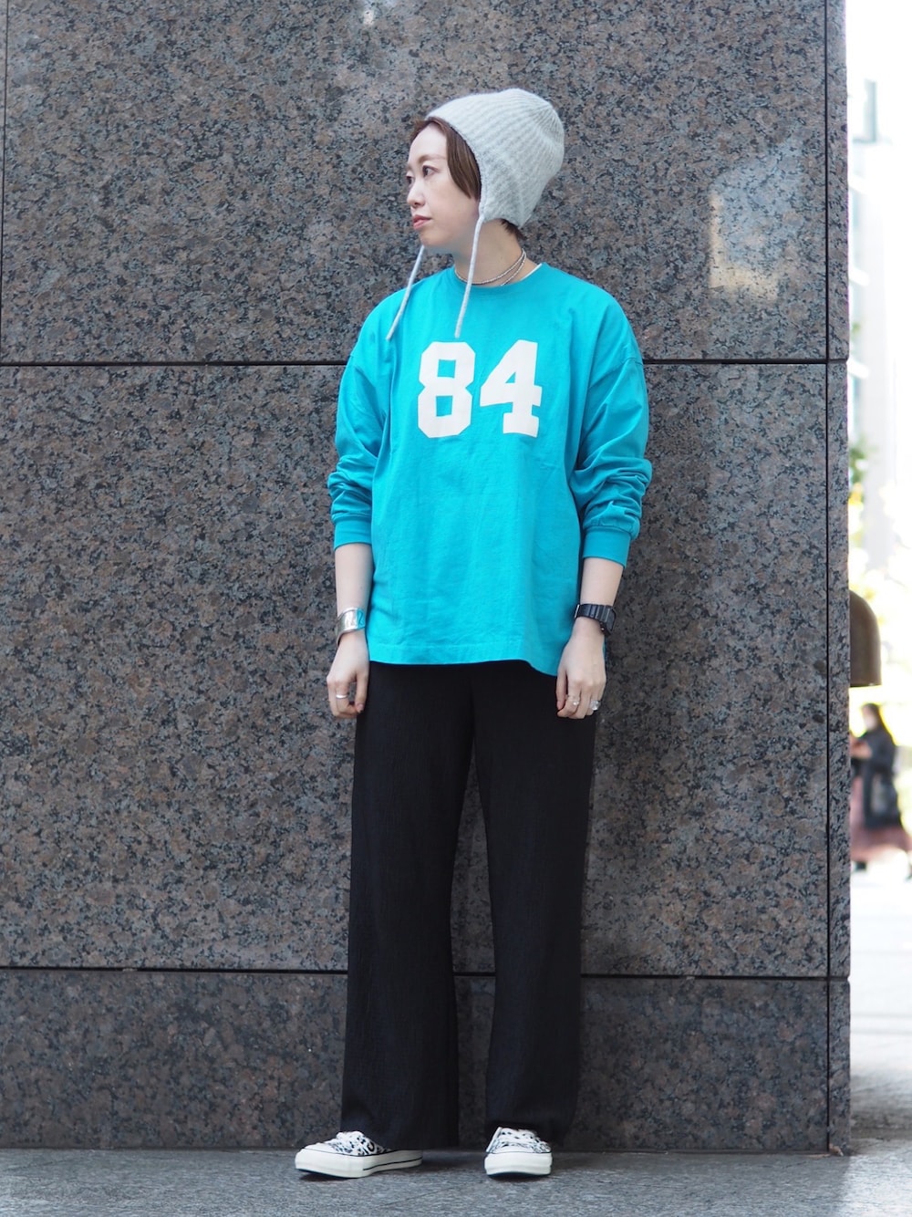 今日のテーマはグレー✖︎ブルー✖︎ブラック⬜️🟦⬛️ ブルーのナンバリングTが着たかった日! 思いのほか、肌寒かったので耳付きニットを被りました🧶