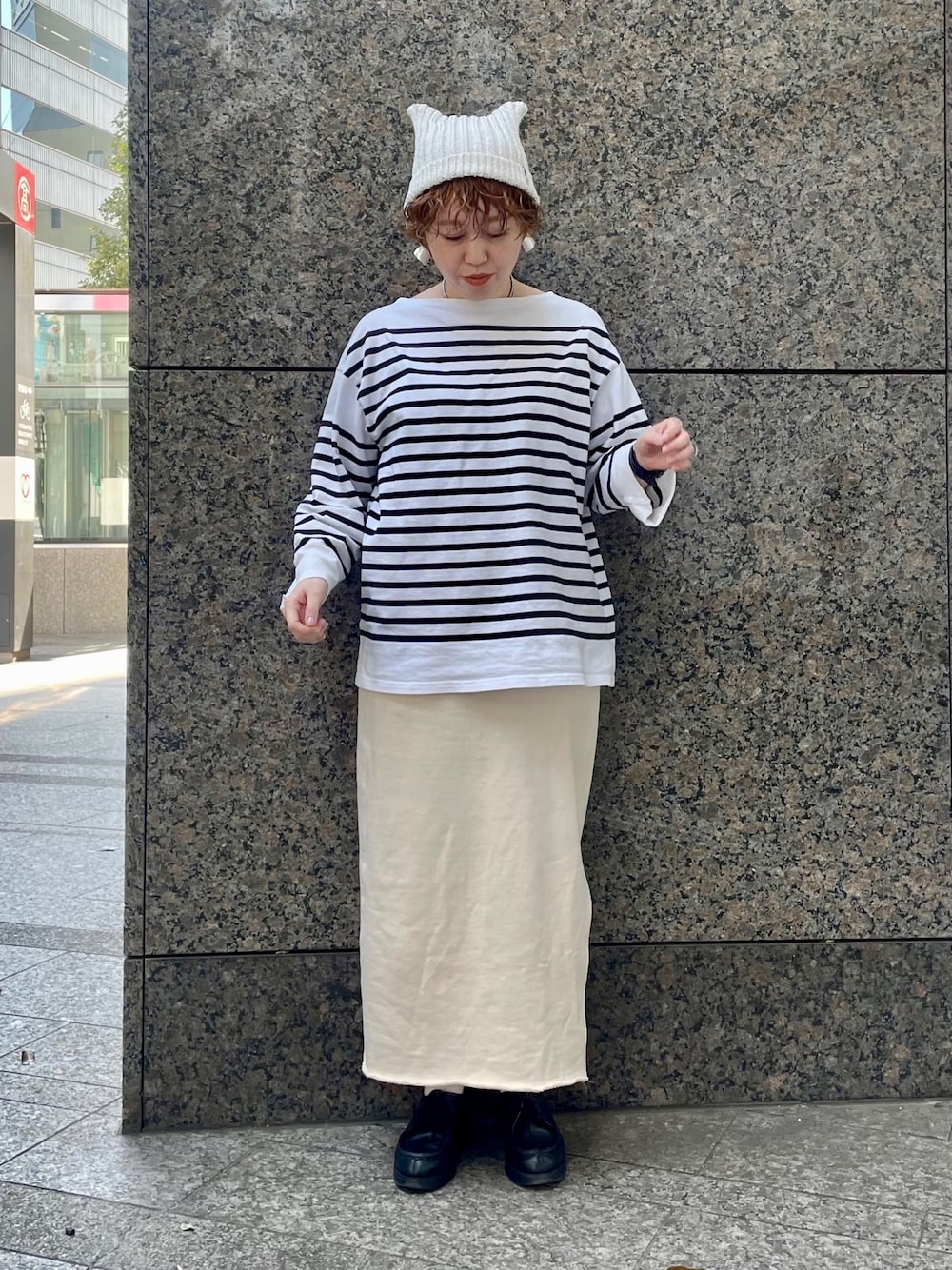 shrimp(OVERRIDE 新宿高島屋)のTシャツ/カットソー「BIGバスクTシャツ(チュニック、ボーダーTシャツ、ビッグシルエットトップス)」を使ったコーディネート