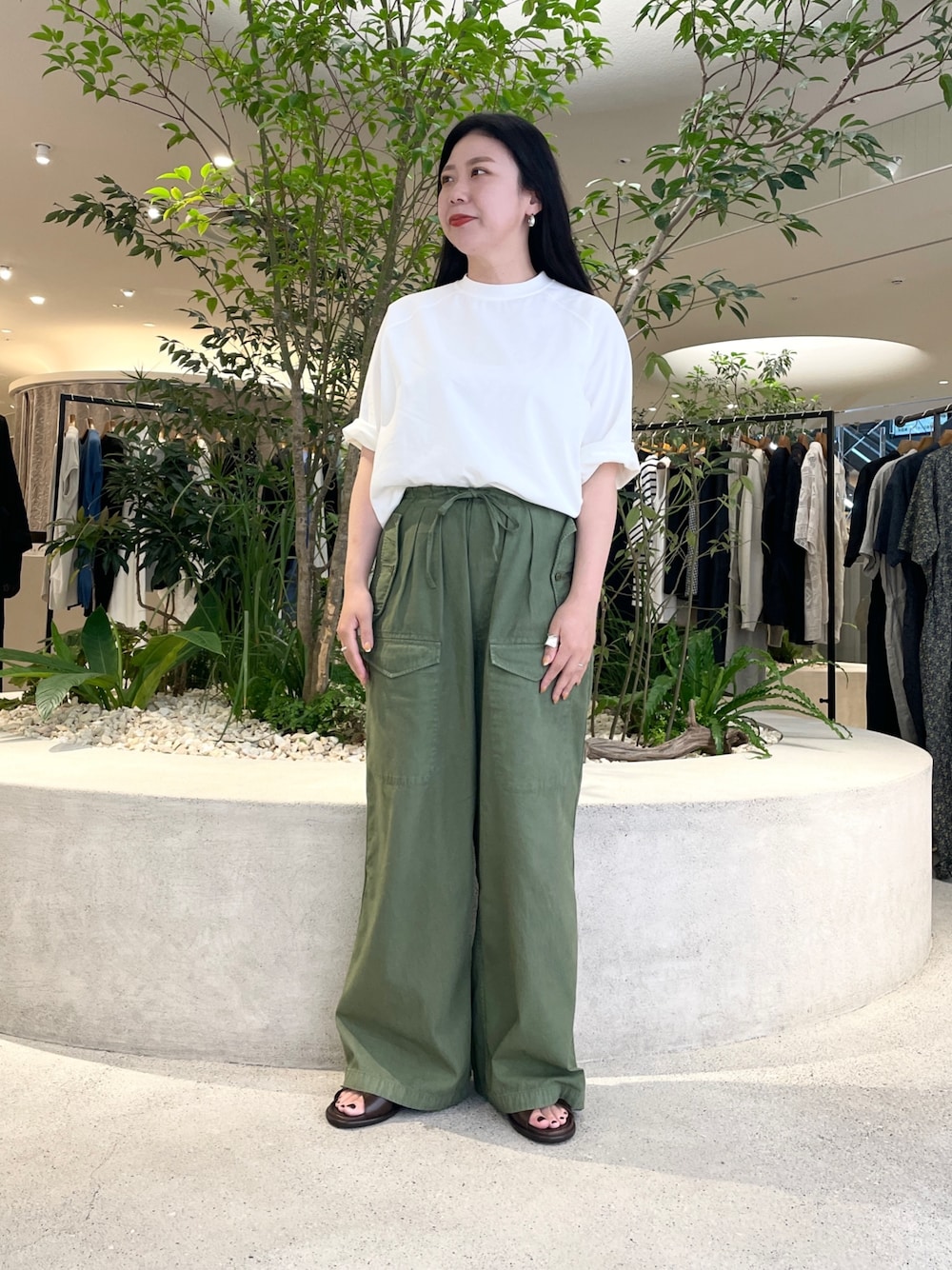 カジュアルなデザインででラフスなスタイリングにピッタリなトップスは、かぐれのカットソーの中でもしっかり目の生地で体のラインが出にくかったです。お袖は少し長めなのでご自身で捲って丈感を調整して頂く事も可能です。 ボトムはTICCAのカーゴパンツを合わせており、デザインがしっかりあるボトムに今回着用している様なトップスの丈感は重宝しますよね! スカートに合わせてもインせずに着れる丈感が◎