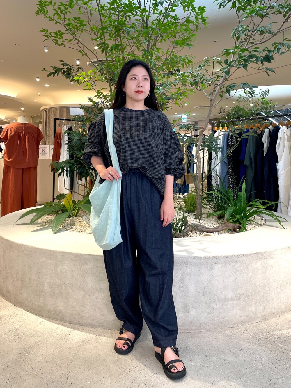 夏だけでなく少し先のシーズンにも着て頂けるお洋服をご紹介します♪ ブラウスは見た目よりとても軽く着心地がとても良かったのと、袖口が一部ゴムになっていたので腕まくりしやすかったです。 ゆったりサイズではありますが柔らかな生地なので、サロペットやウエストインのスタイリングでももたつかずに着て頂けます。 パンツはゆったり履けるサイズ感で足首に向けてスッキリシルエットなので、同じデニムでもワイドパンツより見た目の軽さもでるかと思います。 いつも腰や太もも周りのサイズ感でボトムを選ぶことが多いですが今回のパンツは気になる箇所無しで履けました!