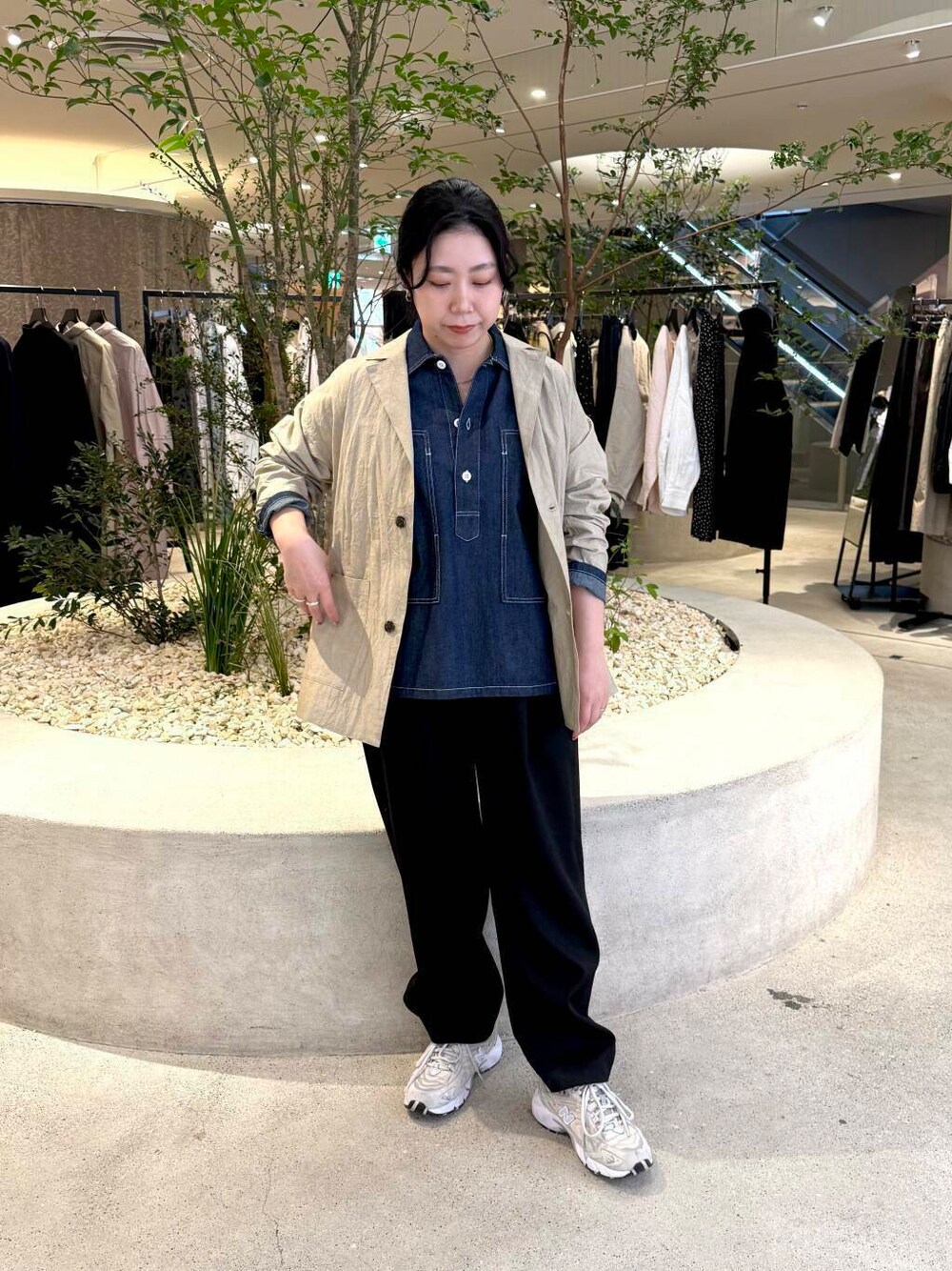気温が不安定な時期にはレイヤードスタイルがオススメです♪ ジャケットはカーディガンだと物足りず、コートだと外の時間がそんなに無いので充分すぎるなという時期に活躍間違い無しの少しハリがあるコットン素材となっています。 サイズ1でもシャツの上から羽織れるサイズ感でした! ボトムスは透け感を気にせず着れる生地で、綺麗めにも履ける着回ししやすいブラックカラーです。 普段太もも周りでボトムスのサイズを選びますが、体のラインを気にせず着れました!