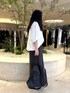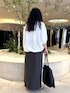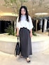 ラフに着れる綺麗め見えスタイリングをご紹介します♪ トップスはゆったりシルエットで体のラインが出にくく、肘辺りまであるお袖が個人的に嬉しいポイントでした! 裾に丸みがあるデザインなのでアウトするスタイリングでもお洒落見えして◎ スカートはスッキリ見えするシルエットで、細身に見えますが着心地はカット素材で窮屈感無く着れます。 一つ前のコーディネートで同じ素材のパンツバージョンもご紹介してますので是非チェックしてみて下さい!