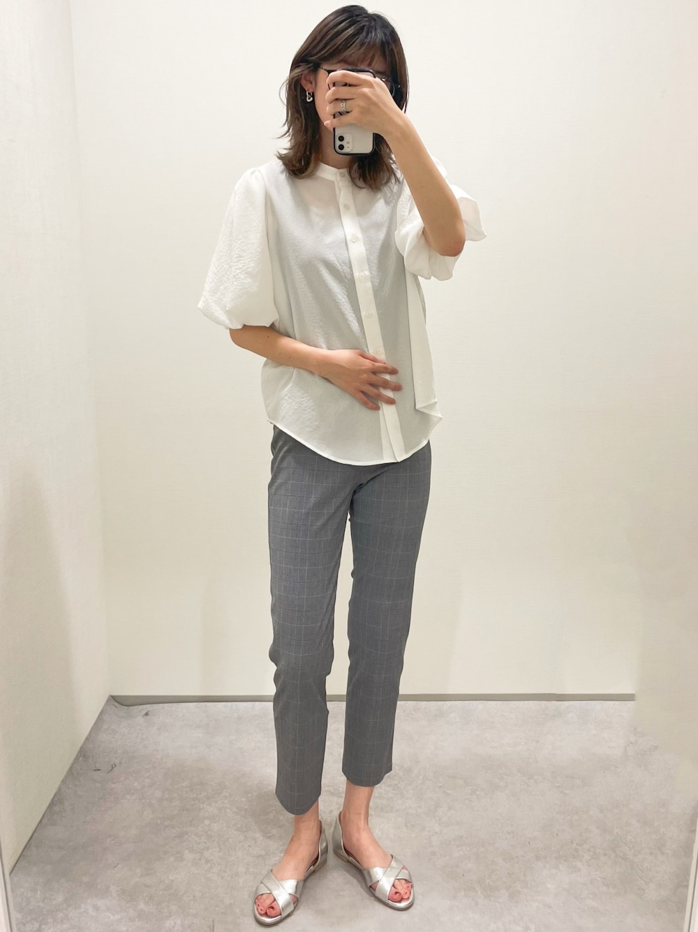 175cm/骨格ナチュラル 【ブラウス】Mサイズ シアサッカー素材のシャツブラウス。ボリューム袖がかわいいです。ボタンを開けて羽織としても🤍 【パンツ】Mサイズ 大好評のひんやりスキニー。ストレッチが効いてらくちんです。 【サンダル】 履くだけでコーデが決まるシルバーカラー🩶