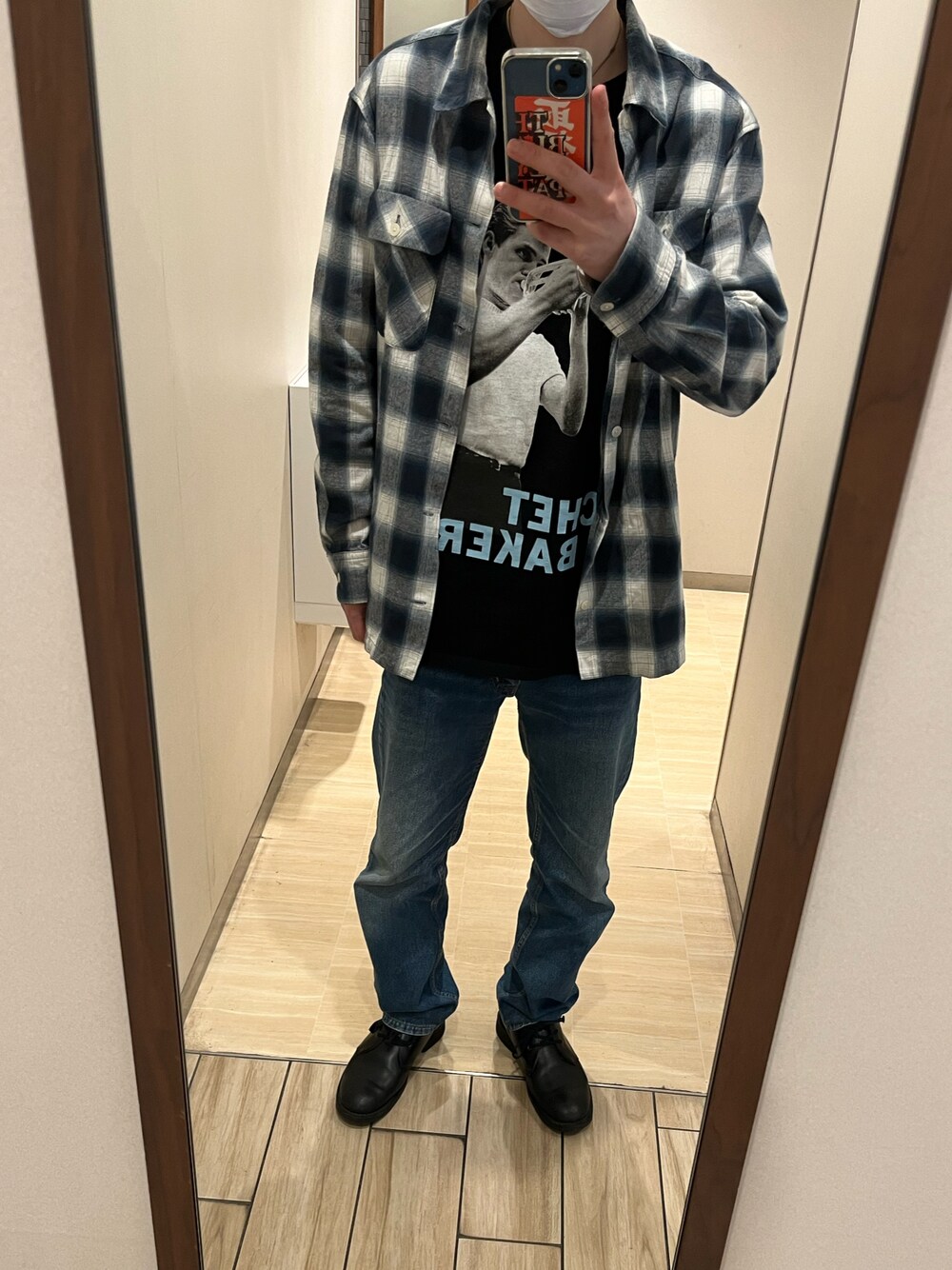 先月の頭に買ったワコマリアのTシャツとneighborhoodのネルシャツを合わせてみました デニムは90s Armaniでネックレスは90s tiffany着用で古着MIXです 靴はDANNERのチャッカブーツ JAZZにそんな詳しい訳では無いけどチェット・ベイカーは前から知ってたのとワコマリアが好きという理由でTシャツ買いました 今までで1番高いTシャツ。。 iPhoneケースには1番好きなブランド BLACKEYEPATCHのステッカー突っ込んでます