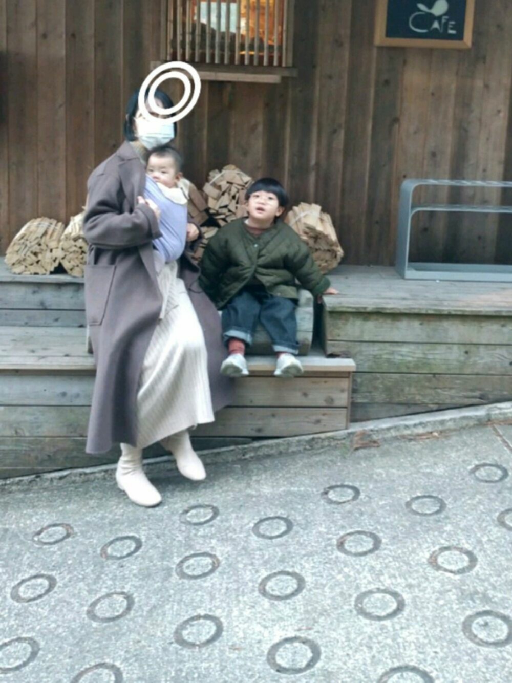 さむい日のファミリーコーデ。 コニー抱っこひもは肩紐がアウターにひびかないのでオススメ。