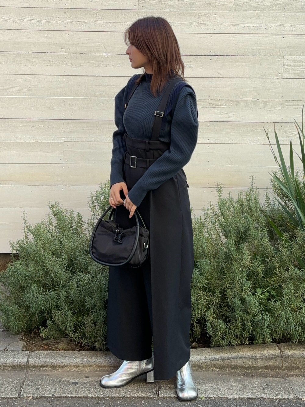 ニットは薄手ですが保温性抜群で、とてもあたたかいです◎ サロペットパンツは超ハイウエストなので、スタイルアップしたい方は是非!