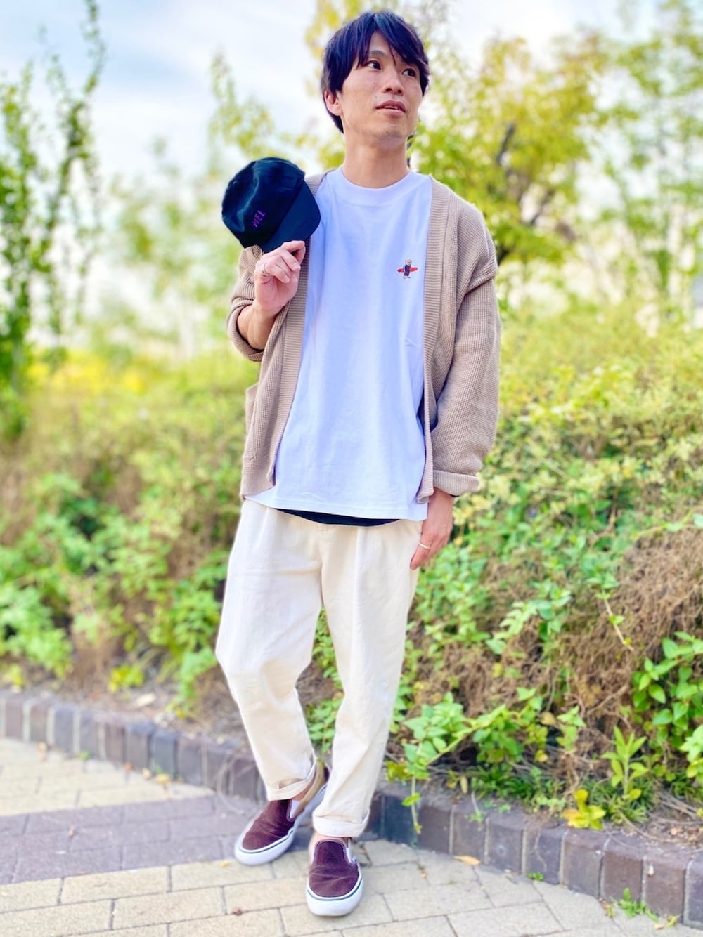 みなさんこんにちは♪ 着用しているTシャツは、胸にBEARの刺繍を施しており、一枚で着てもオシャレ☆ もちろん重ね着してもOK!