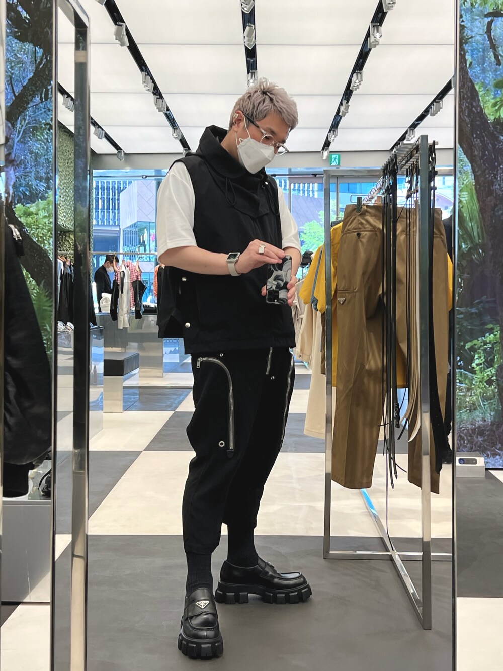 Prada宮下パーク店でローファー買う際 来てたコーデです。 tシャツ以外黒です。
