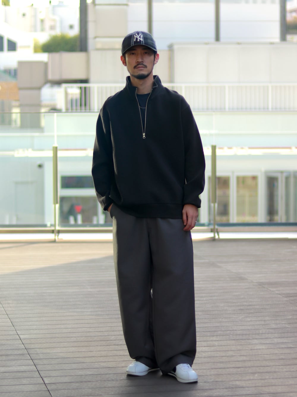 ワントーンで合わせました。秋に活躍するハーフジップのスウェットはどんなスタイルにもハマりそうな万能アイテムです!