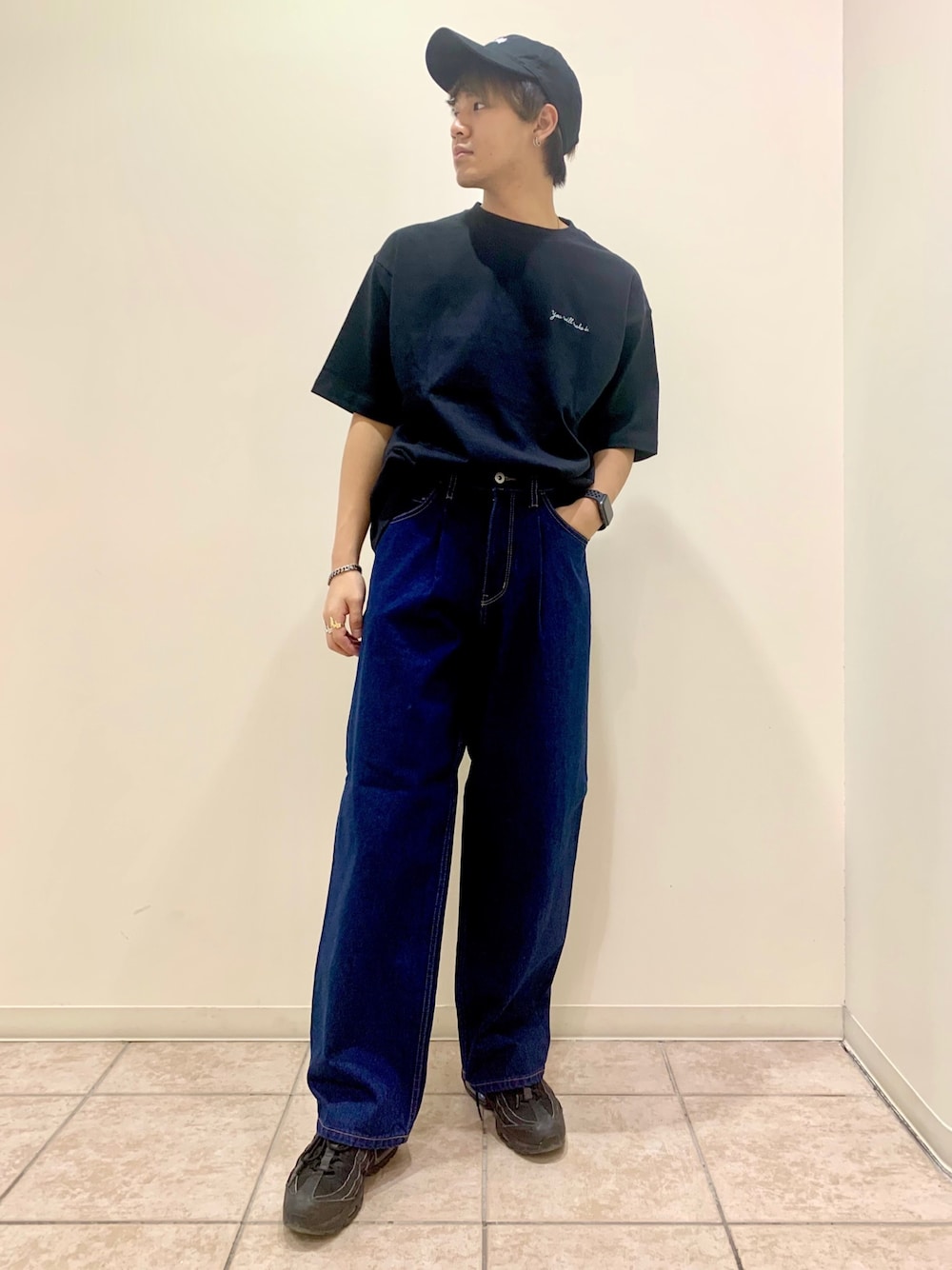 今回はデニムワイドパンツを取り入れたブラックカラーコーディネートです。 Tシャツをタックインすると脚長効果が出ます! あえてパンツを大きく履くことで、より長く見せることもできます! 黒いスキニーでワントーンにしたり、フレアパンツでモードに抑えてもかっこいいですね!