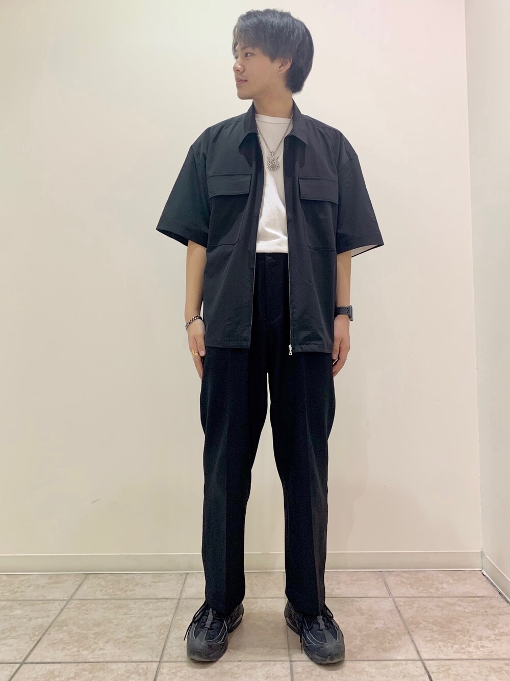 今回はセットアップを使ったモノトーンコーデです! シンプルにまとめてネックレスでアクセントをつけています! ウォレットチェーンを取り入れるとよりシルバーが強調されるので、アクセントが増えます!