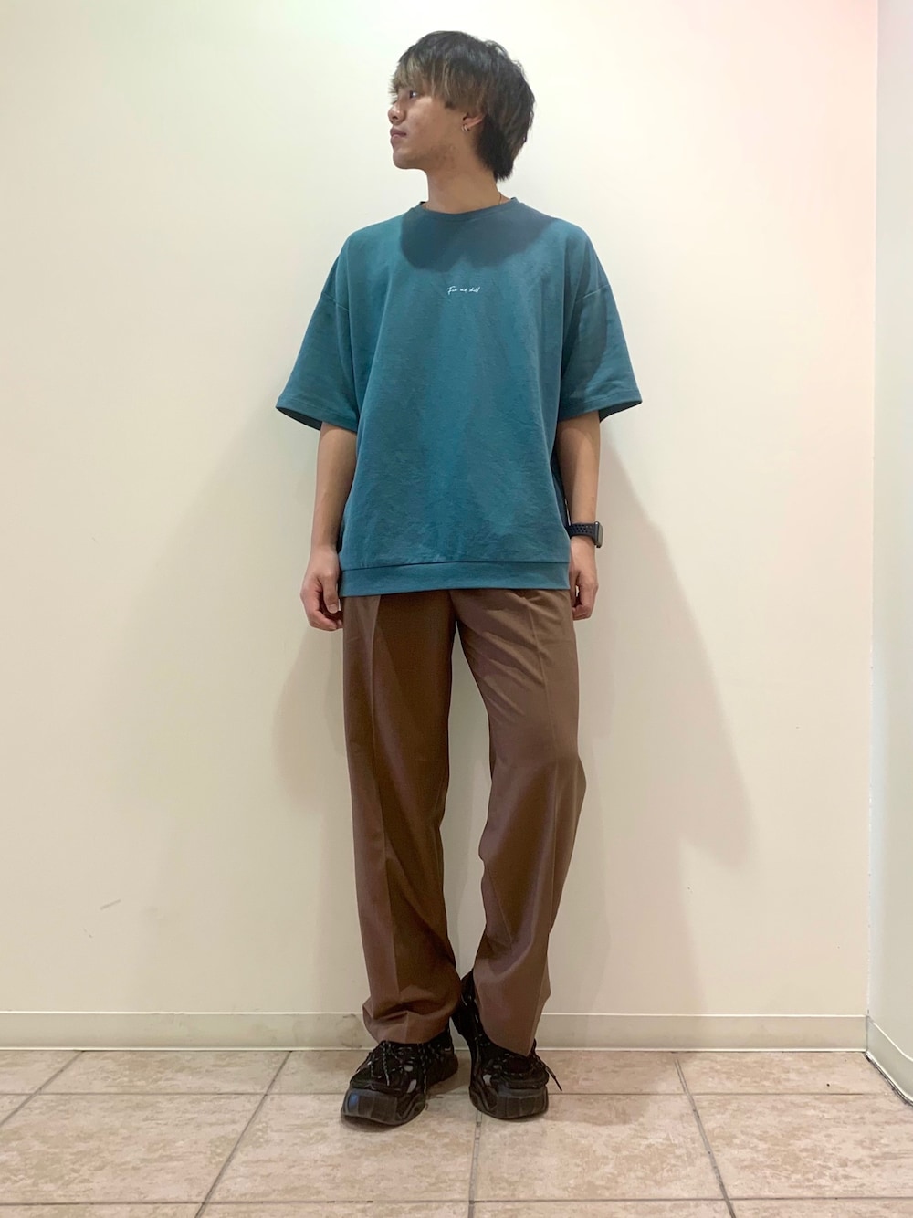 ゆるいシルエットのアイテムを組み合わせて夏に向けたコーディネートにしてみました! パンツは柔らかくて生地の薄いワイドパンツを使っているため、ボリュームのあるスニーカーを組み合わせて少しカジュアルに寄せています! シンプルなTシャツでワンポイントにネックレスを組み合わせるとよりアクセントになると思います!