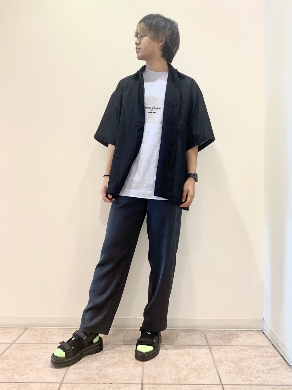 透け感のあるピンタックのシアーシャツを使ったきれいめなコーディネートです! パンツは光沢感とドレープの強いサテンワイドパンツを組み合わせて少しモードな雰囲気にしています! インナーにシンプルなロゴTや柄シャツを組み合わせてもより雰囲気を変えられるのでお試しください!