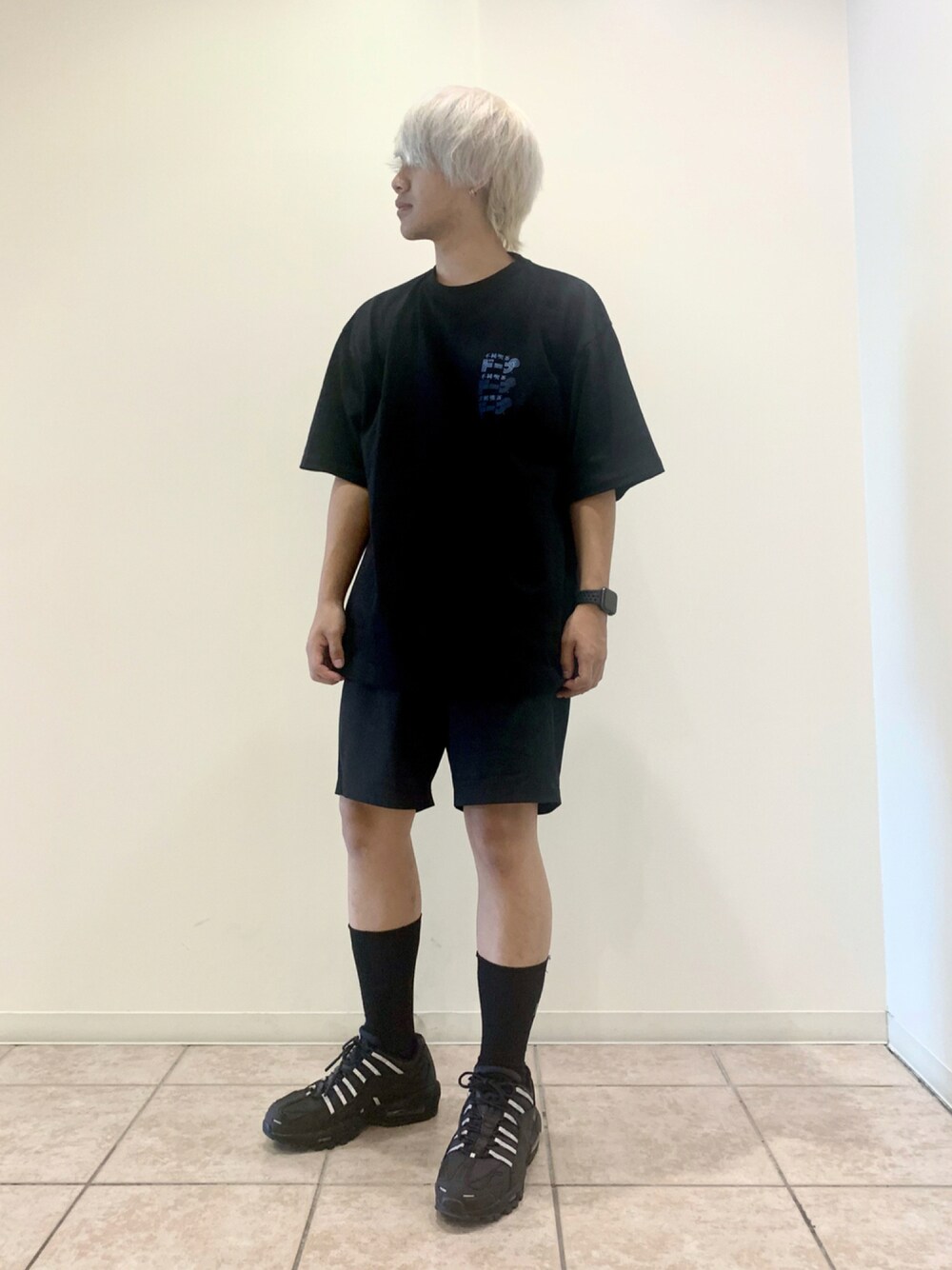 バックプリントの入ったゆるいシルエットのTシャツとショーツを組み合わせたオールブラックなストリートコーデです! アクセサリーをつけて全体の雰囲気をまとめることもできます!