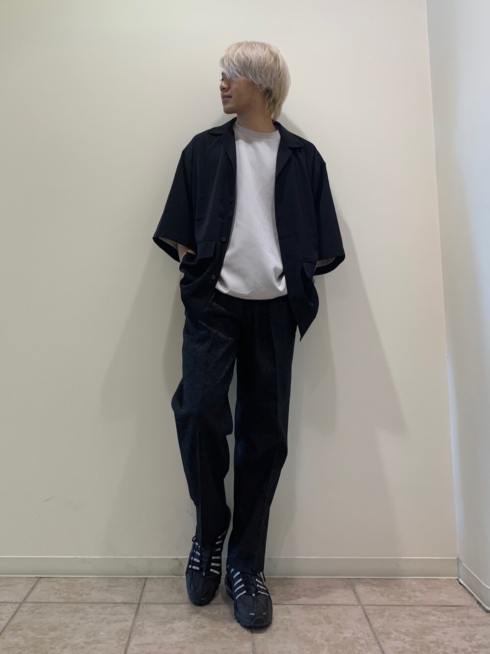 オープンカラーシャツとジャガード柄のパンツを組み合わせたキレイめモードなコーディネートです! モノトーで抑えることで全体のシルエットを引き締めることができるのでおすすめです! 足元はサンダルや革靴でも雰囲気を変えられるのでお試しください!
