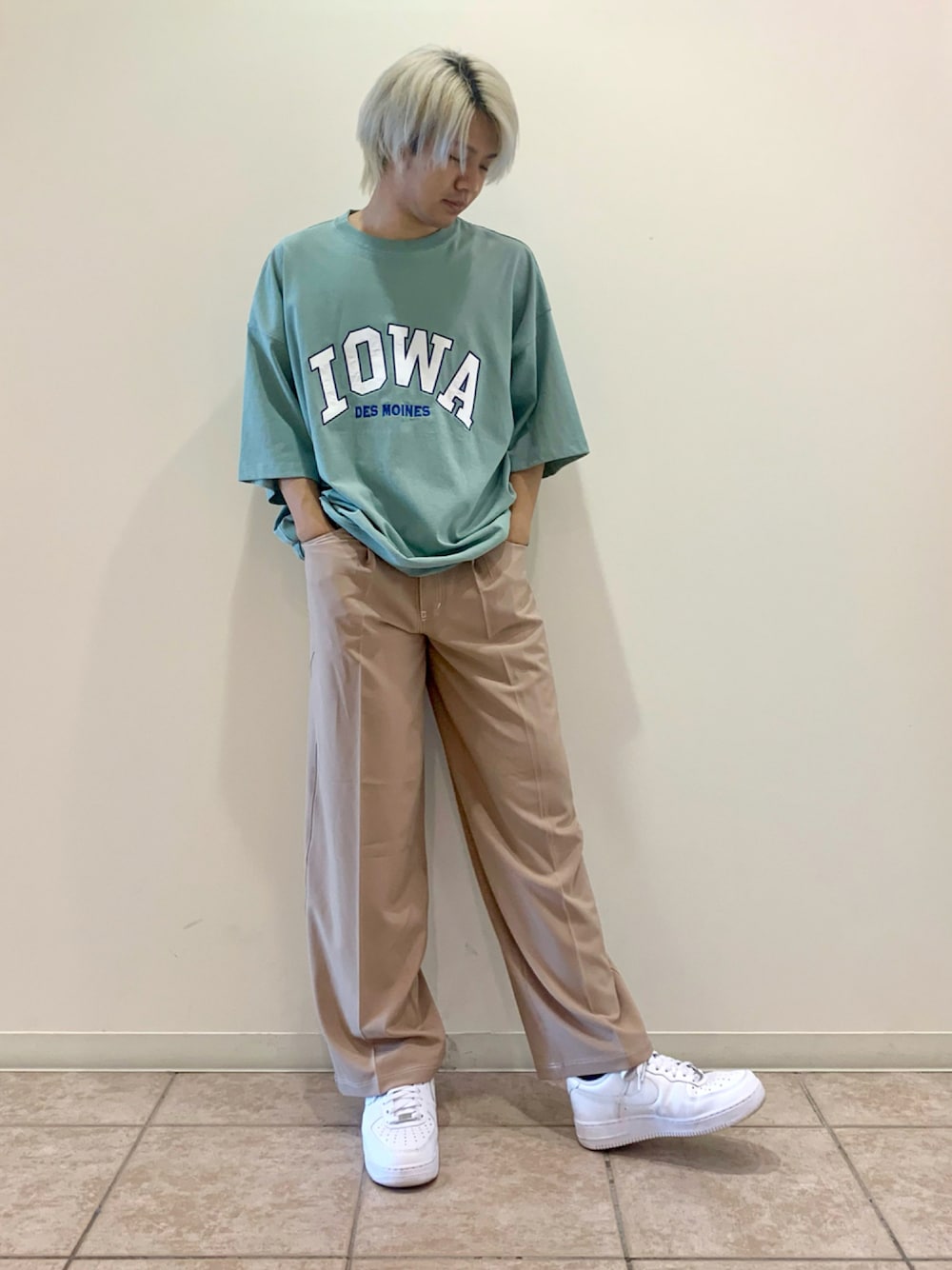 オーバーサイズのカレッジTシャツを使ったカジュアルストリートなコーディネートです! 明るいカラーリングを使い、シンプルにまとめています!