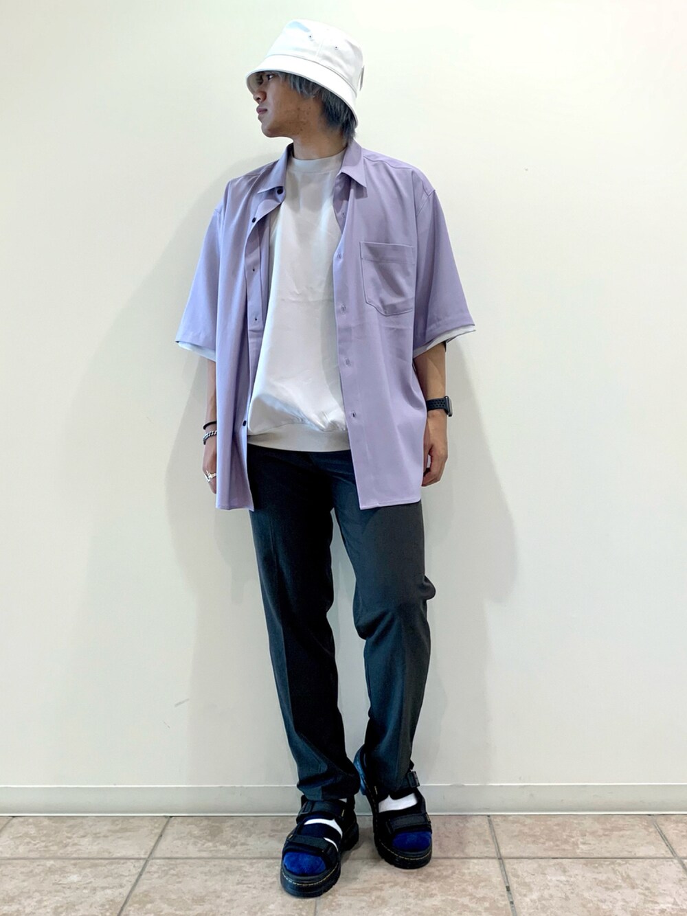 ラベンダーカラーのシャツを使ったきれいめなコーディネートです! サイズ感はゆるく着てシルエットをゆったり見せています! パンツはスリムになものを使い、足元まできれいに見せることができます!