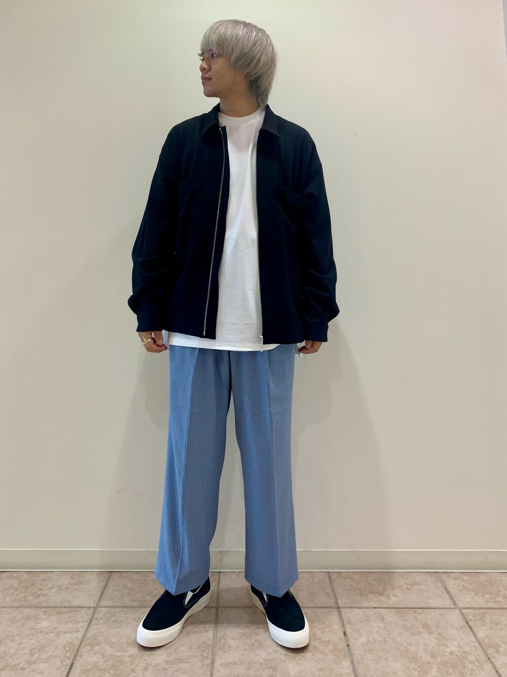オーバーサイズのZIPブルゾンと、ワイドパンツを使ったシンプルなカジュアルコーデです! 気温も徐々に下がってきたので秋に向けて長袖を使っています! インナーは白ロンTで脱いだときもバックプリントで印象を強くできます! スニーカーはスリッポンで軽い印象を!!