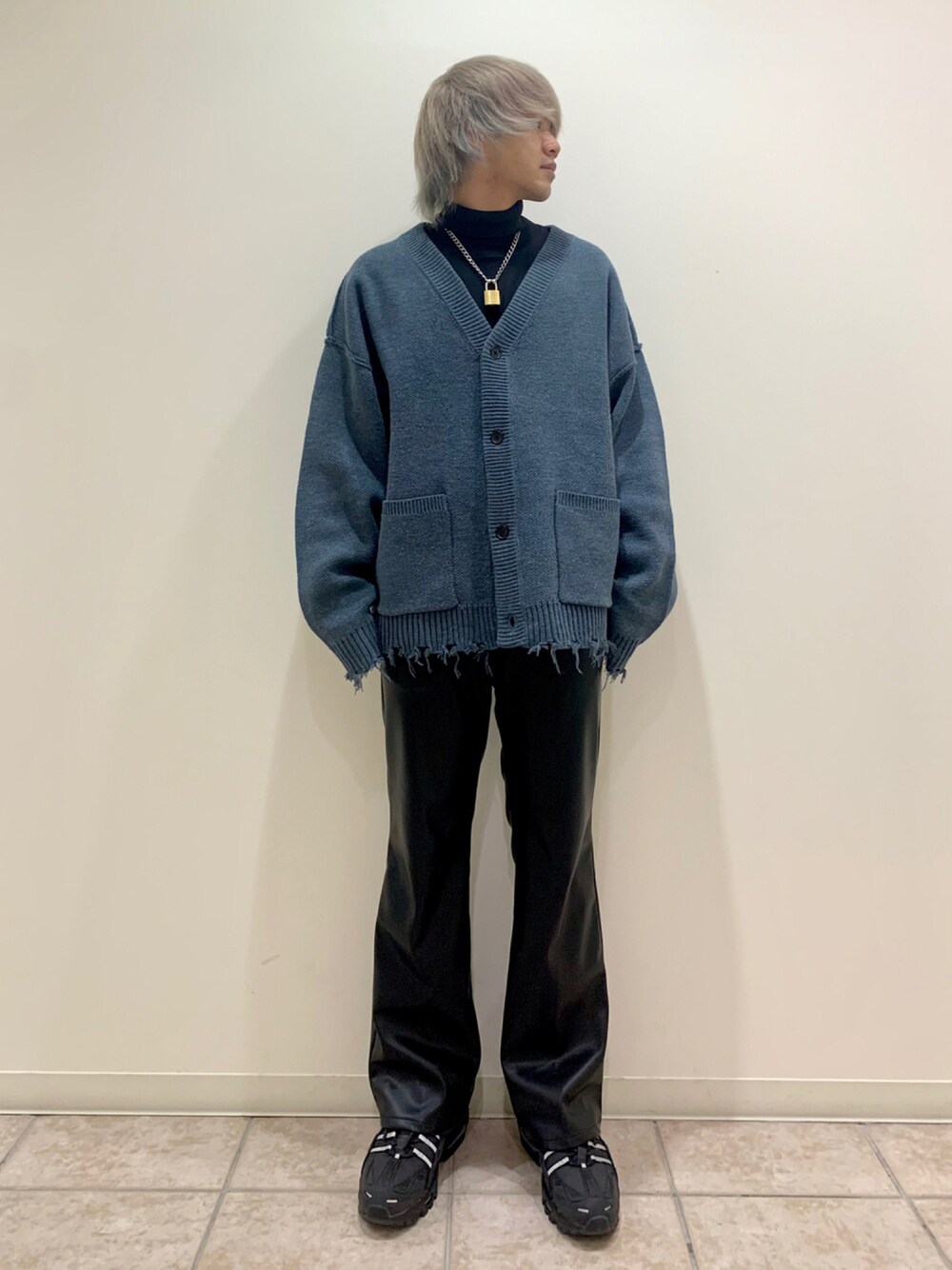 皆様お久しぶりです! 今回はダメージニットルーズカーディガンを使ったキレイめモードなコーディネートにしてみました! 上半身をルーズなシルエットで抑え、パンツをレザーのフレアパンツにして全体のバランスを整えています! 個性を出しやすいので、周りと差をつけるのにおすすめです!