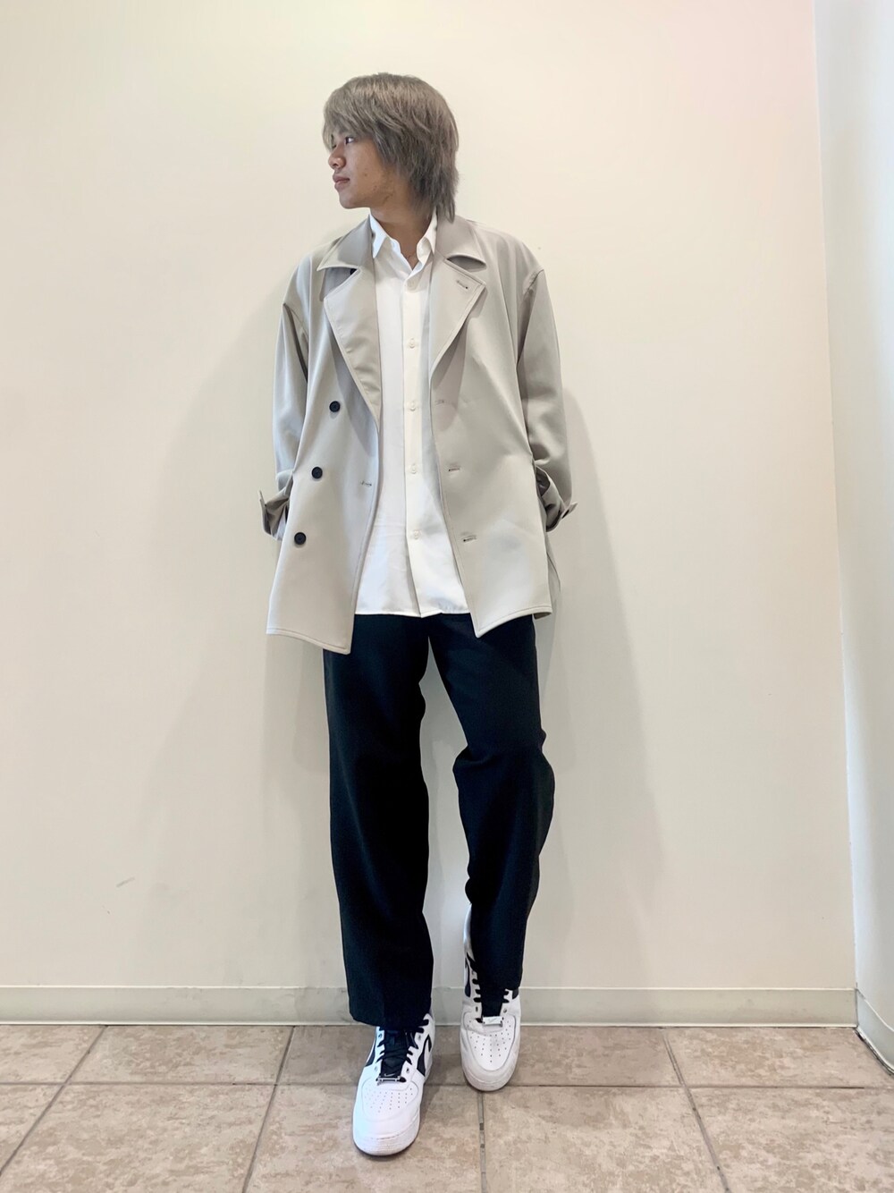 シャツとジャケットを使ったシンプルなきれいめコーディネートです! 足元にダッドスニーカーを取り入れ、少し雰囲気を崩して中和しています! サイズ感はゆるく、ルーズなシルエットにして柔らかい印象にしています!