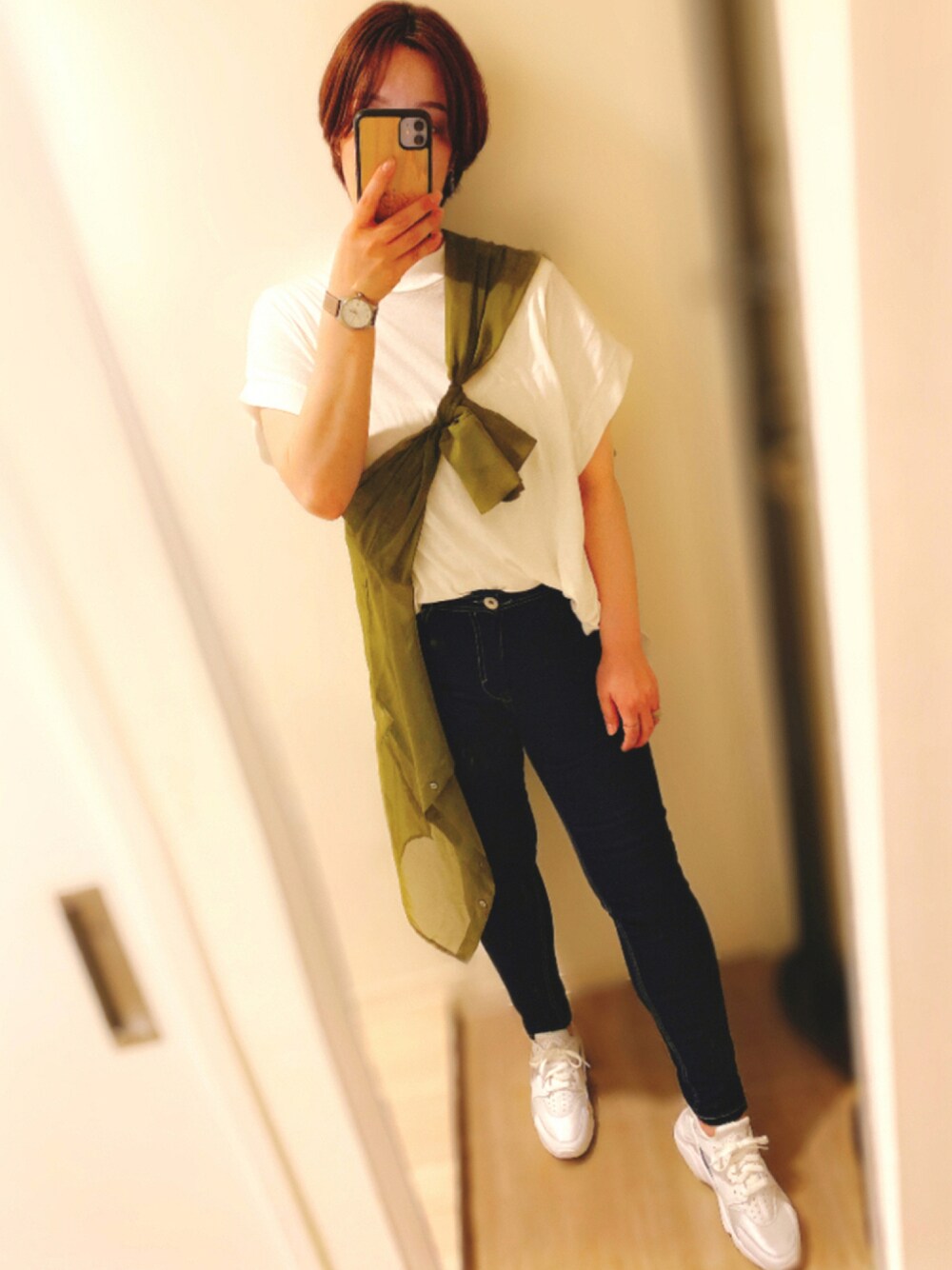 たすき掛けに挑戦! シンプルに白Tとスキニー、スニーカーで カジュアルかつメンズライク風に👏 スニーカーが可愛すぎて衝動買い💓笑 白Tも形が綺麗でこの夏ヘ大活躍の予感!
