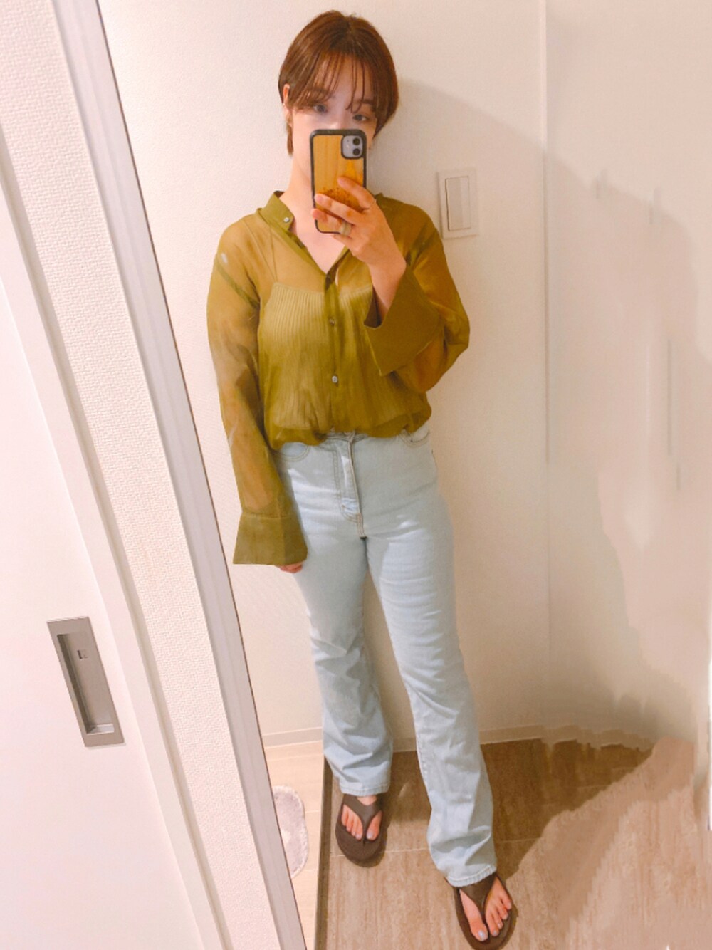 グリーンのシースルーシャツに薄色デニム Ubyのフレアデニムが優秀! 特に膝下のシルエットが綺麗で足長効果抜群👏✨ ショートヘアにしてからカジュアルコーデ増えてきた😂💓
