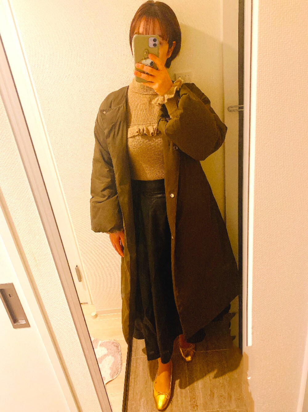 ついにカポックコートを着る日が来た💓 SLOB IENAのニットは去年一目惚れして購入🧶 レザーのスカートと合わせて大人っぽく 最近はカジュアルコーデが多いくて 久しぶりのきれい目コーデは少し緊張…😂