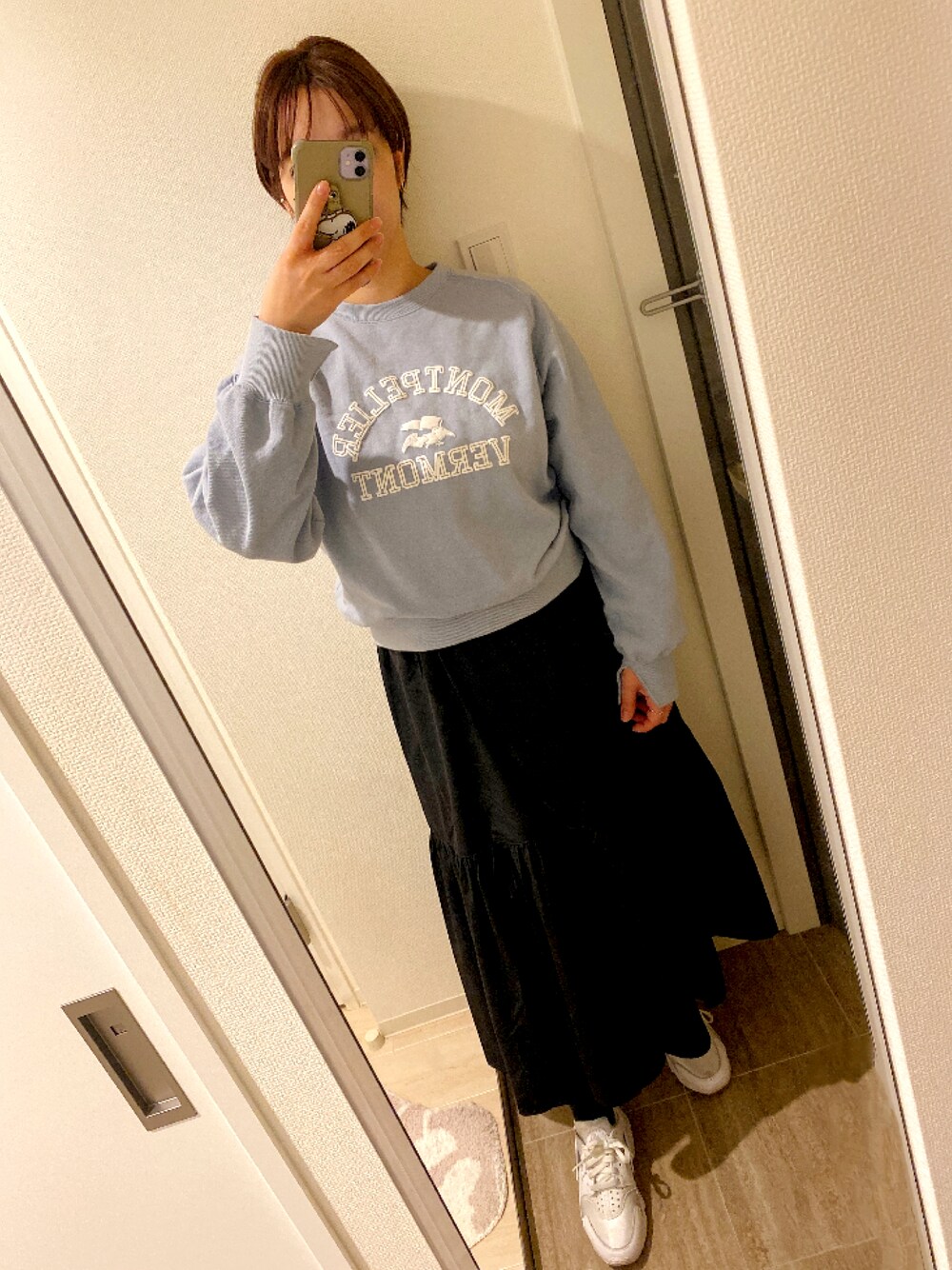 一目惚れしたUngridスエットとGUのスカート💙🖤 スエットブルーの色合いとスカートのやりすぎてないティアードが可愛い😍 リラックスコーデで映画鑑賞