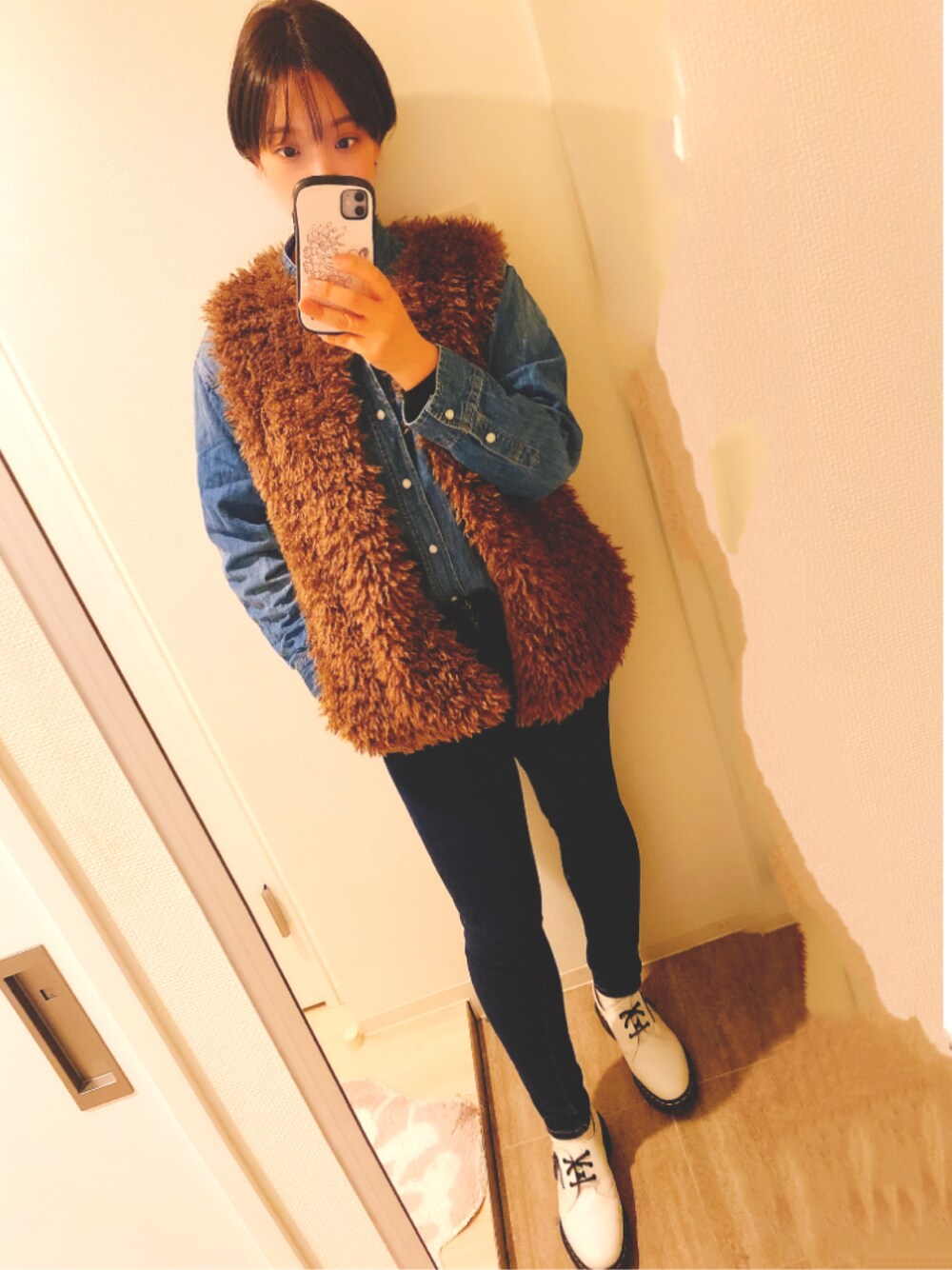 デニムオンデニムに挑戦 mysticのファーベストはやっぱり可愛い💓 これ一枚羽織ればオシャレに見える👏✨ 久しぶりのDr.Martens👞 形もきれていで足元を見るたびにワクワクする🤩