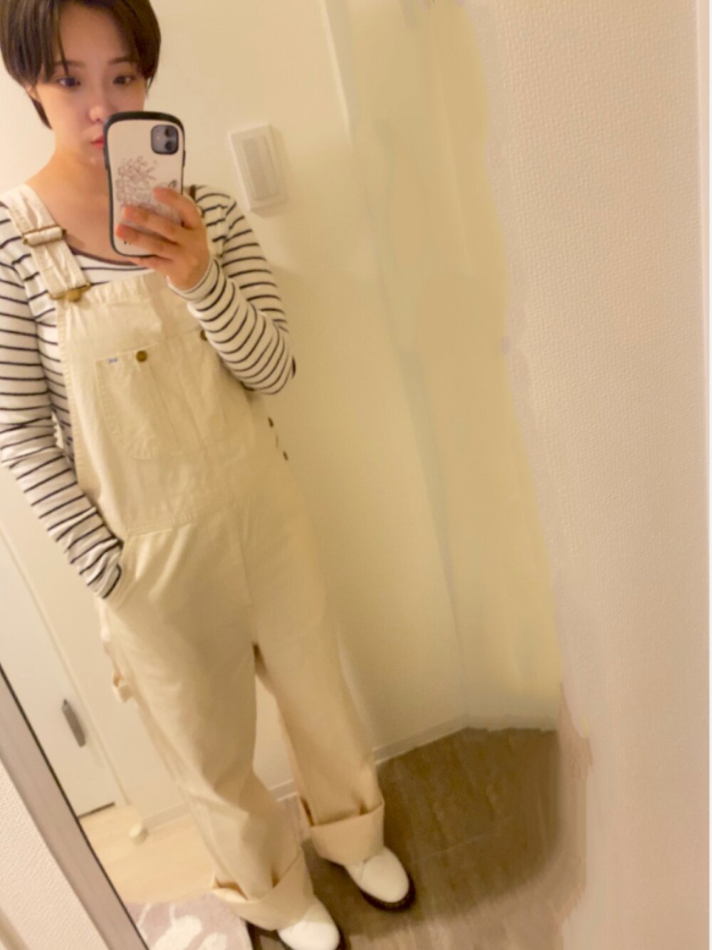 一目惚れした白サロペット あえてオーバーザイズで着るのがいい! 後も可愛い💕 下はボーディスーツを着て少し女性らしさを出して 髪型はセンター分けでサンハム風に トップス以外はメンズライクなアイテムと合わせてお出かけ👣
