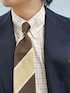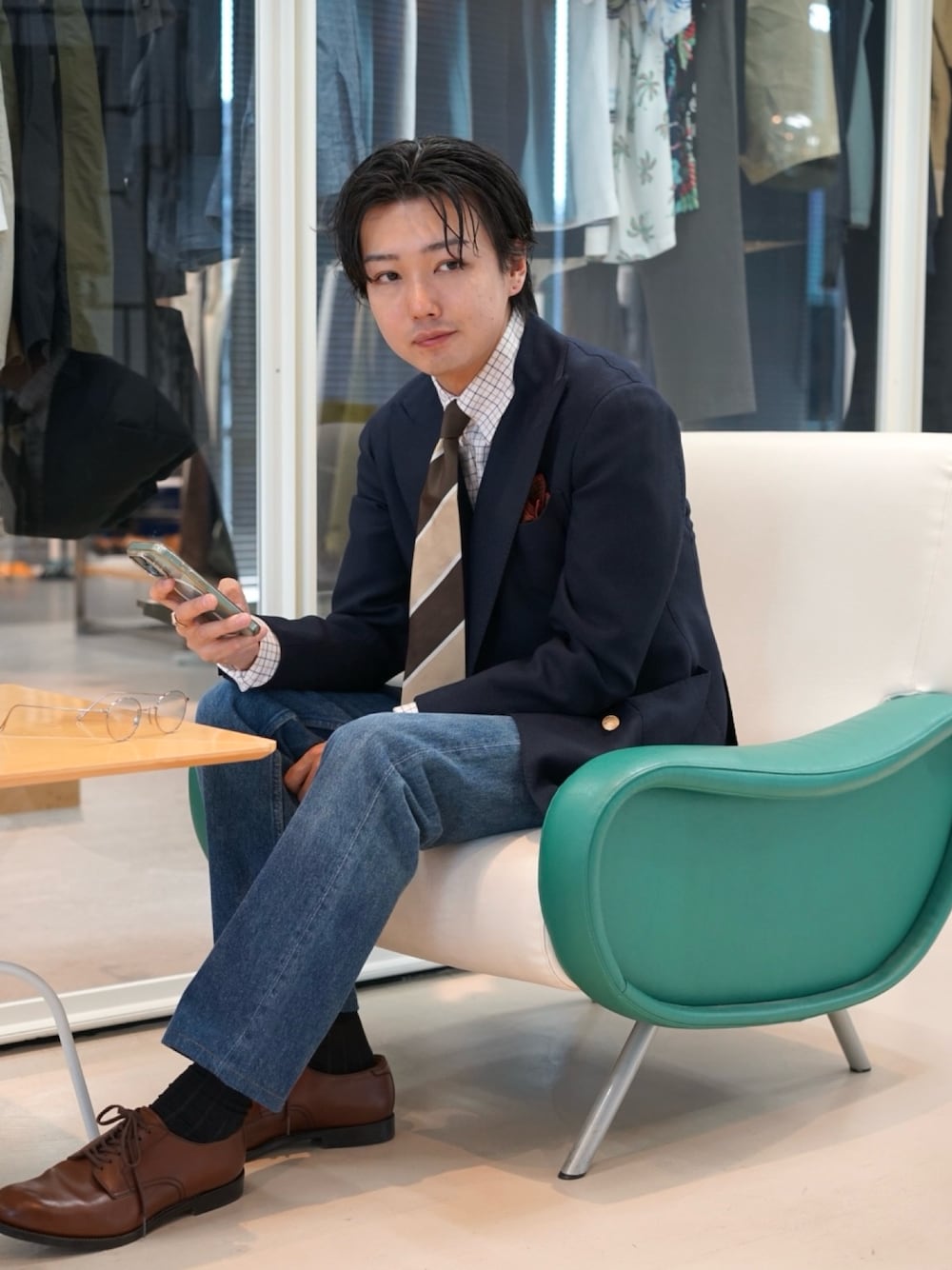 【H.171/ジャケット44/シャツ38】ネイビーブレザーとデニムパンツでトラッドなスタイリングです。タッターソールのシャツに大柄のネクタイを合わせたのがポイント