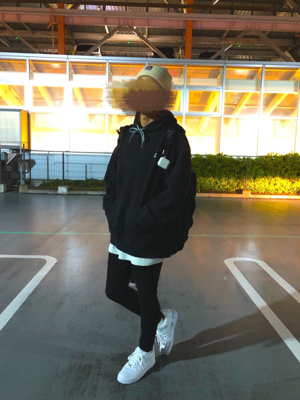 一個前のコーデのプラス1枚です! Tシャツじゃやっぱり寒いかなって思ったら、オーバーサイズのパーカー1枚リュックに入れとけば、こんな感じで着こなせる😁