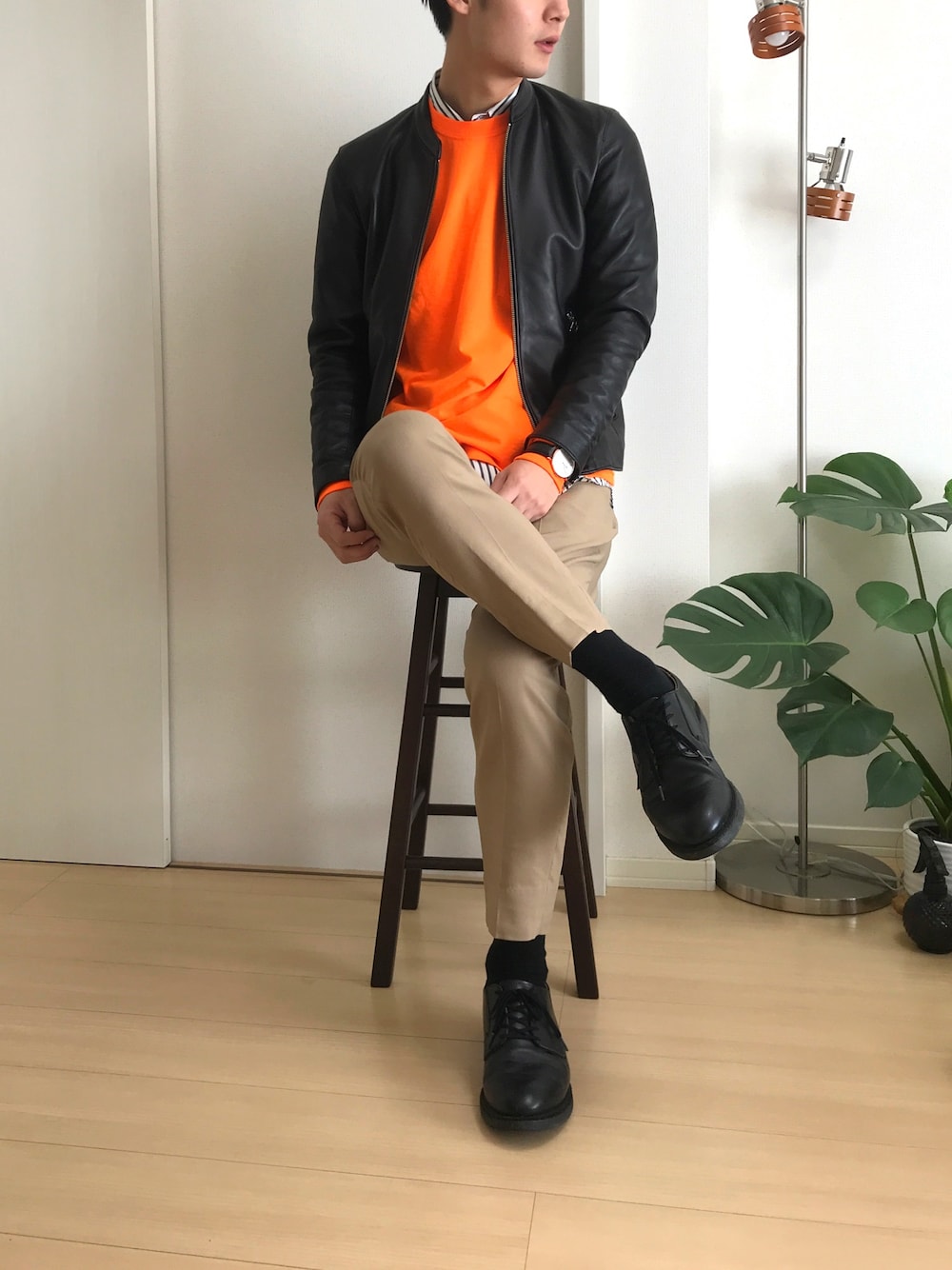 レザーにオレンジ🍊 やはりライダースはシングルかな。
