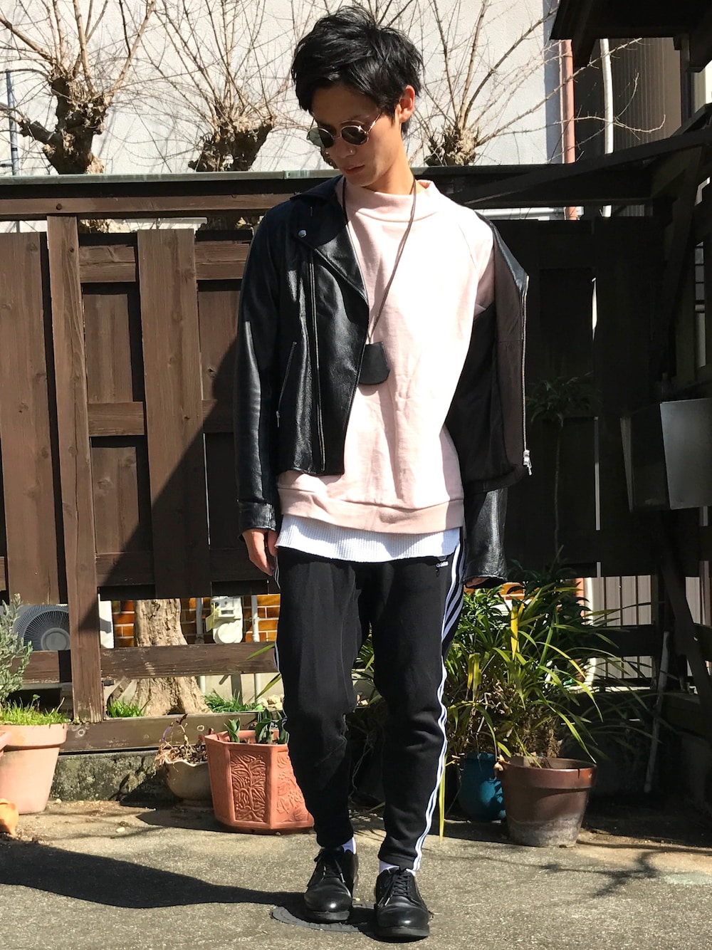 こんばんは✨ ご観覧ありがとうございます。 ピンクコーデ第2弾 今回は前回登場させたピンクスウェットにダブルライダースを着用。 パンツはアディダスのトラックパンツ。 春のクールなスポーツMIXスタイルです。 クールという事でサングラスも着用笑 それでは😌✋🏻