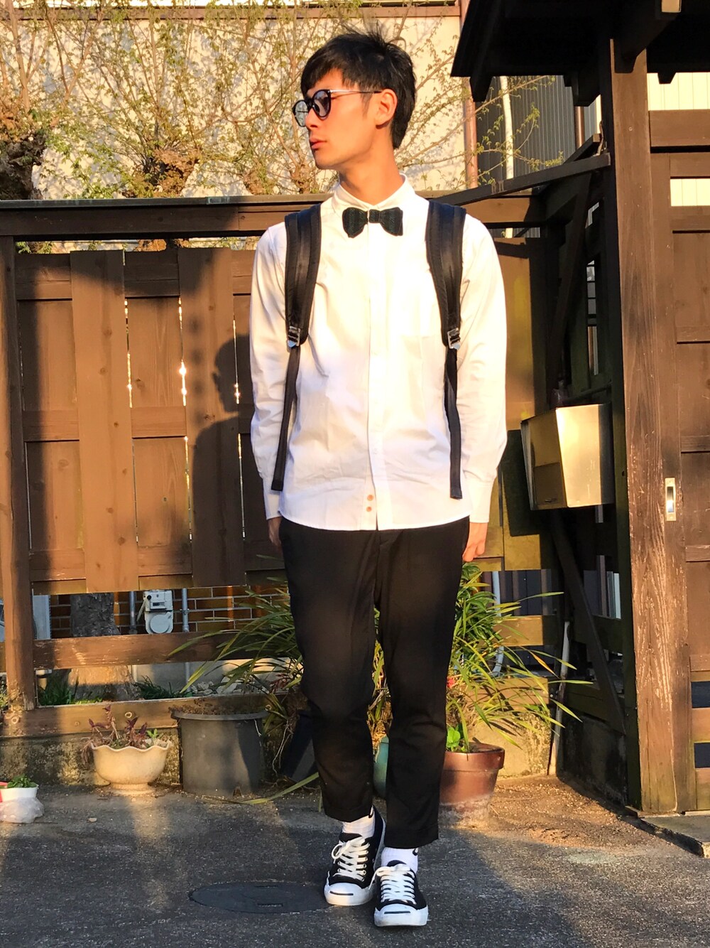 ご観覧ありがとうございます。 インスタグラムではお座りコーデを載せたので、wear では全身コーデ。 モノトーンにデザインシャツ。 蝶ネクタイはフェイクです笑