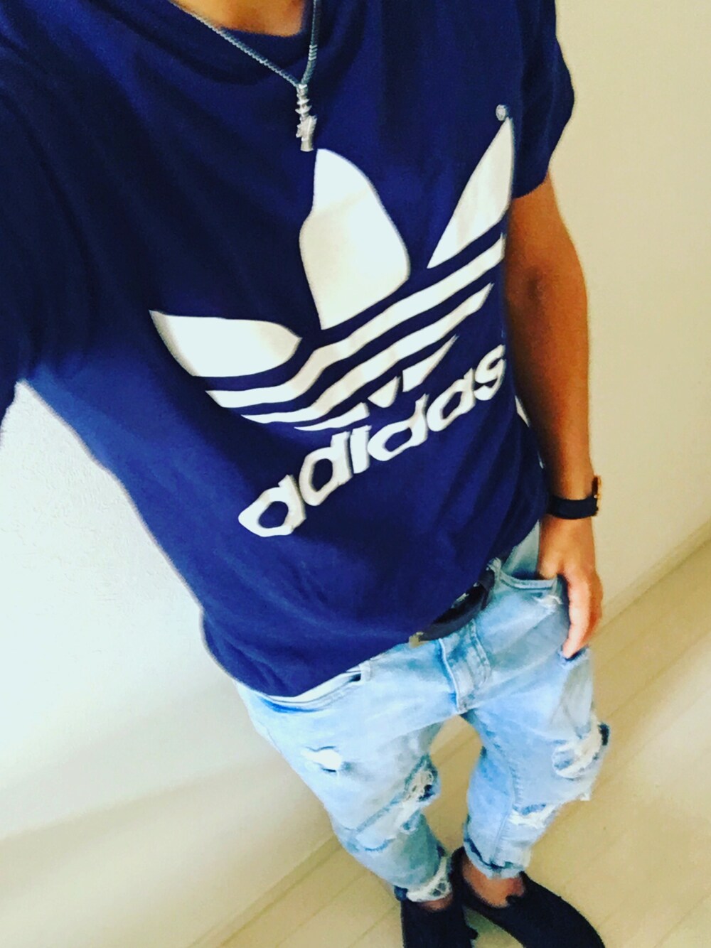 いつもいいね!やフォロー有難いです‼️ 俺もここでみて勉強してます笑 今日は休みなので服探しの旅にでます笑 お気に入りのadidasシャツと ダメージジーンズで青にまとめて 夏らしく!靴色は黒で全体が ダラっとならないように 引き締めてみせました^_^